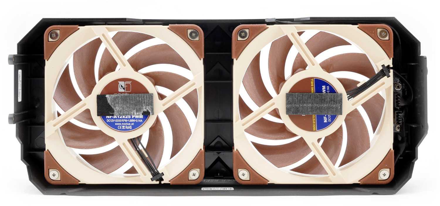 Штатно ASUS использует осевые вентиляторы диаметром 92 мм, однако на видеокарте Noctua Edition они уступили место 120-мм моделям NF-A12x25 (тест), завоевавшим немало наград. Что привело к увеличению высоты до 147 мм (в данном классе производительности чаще всего встречаются модели высотой 110-120 мм) и экстремальной толщине 87,5 мм.