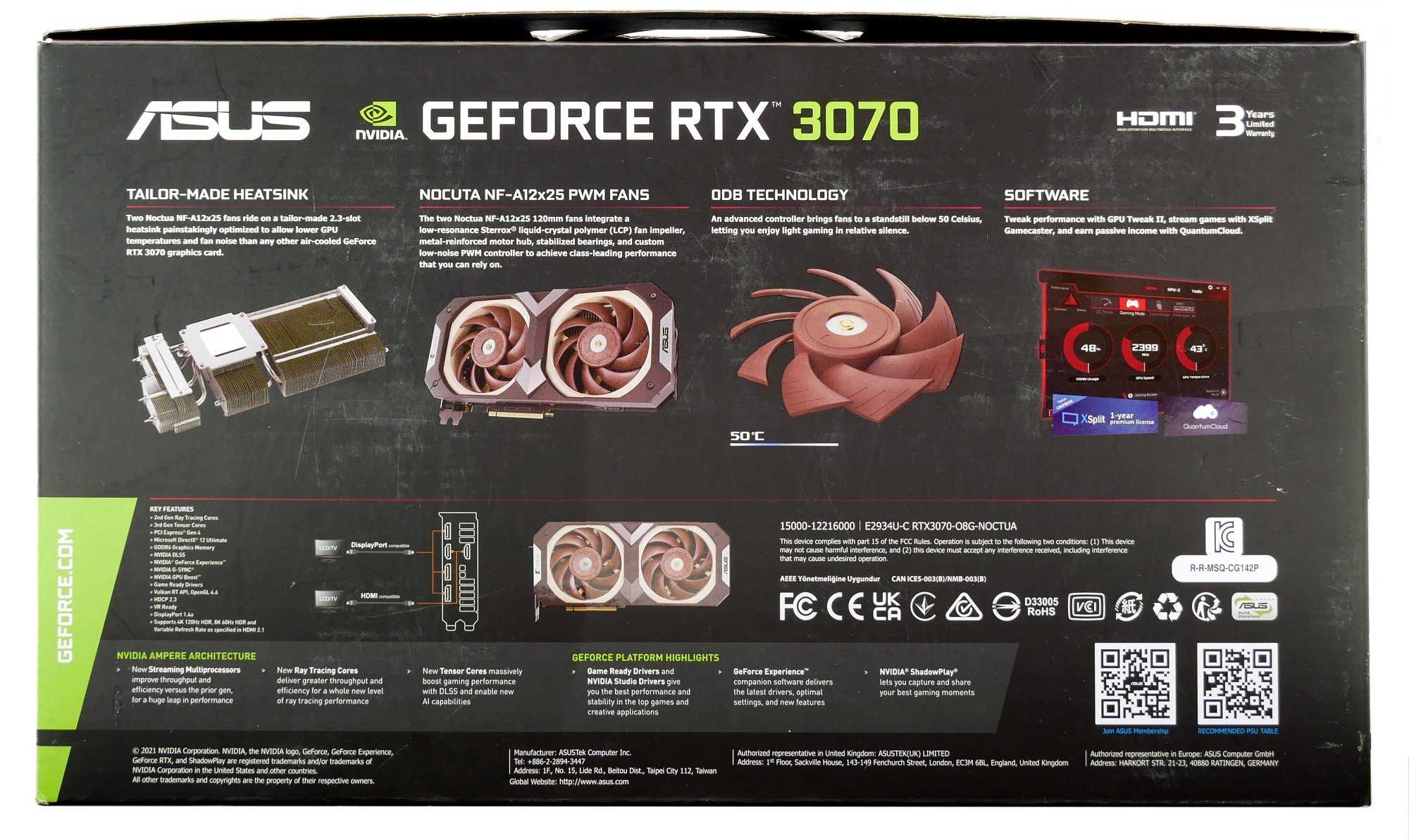 С лицевой стороны нас сразу же встречает изображение неимоверного и фантастического продукта в лице видеокарты ASUS GeForce RTX 3070 Noctua Edition с характерным слоганом «ASUS x Noctua», не хватает лишь фразы «братья навек». Крупным шрифтом нельзя не заметить подписи, информирующие о заводском разгоне, 8 Гб видеопамяти и поддержке интерфейса PCIe 4.0.