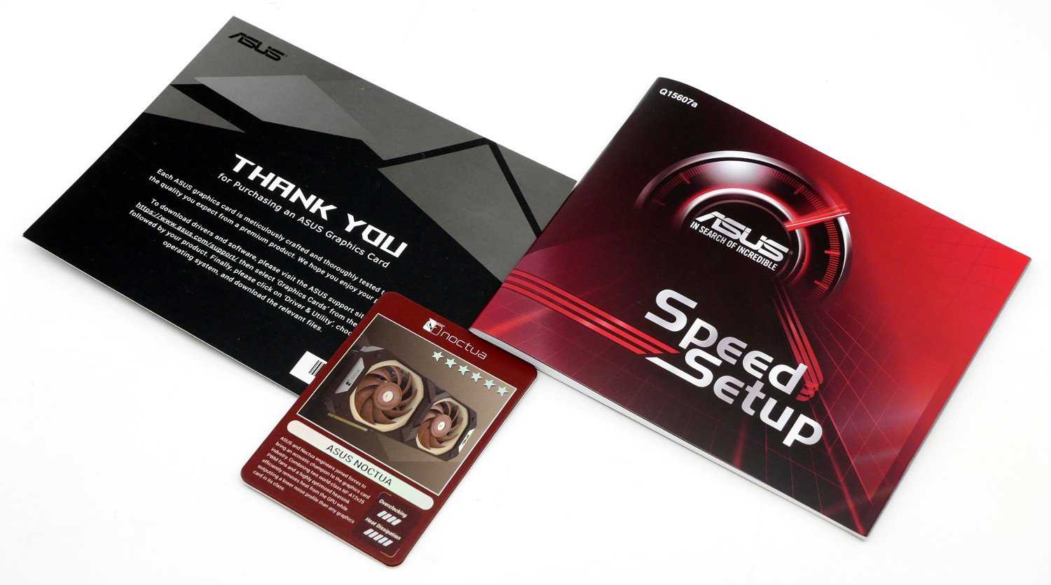 В отдельном конверте располагается весь немногочисленный набор комплектации. Пользователю доступно руководство по сборке, благодарственная брошюра и игральная карта с фирменной оценкой от производителя, судя по которой разработчики из ASUS дали ей шесть звезд из пяти!
