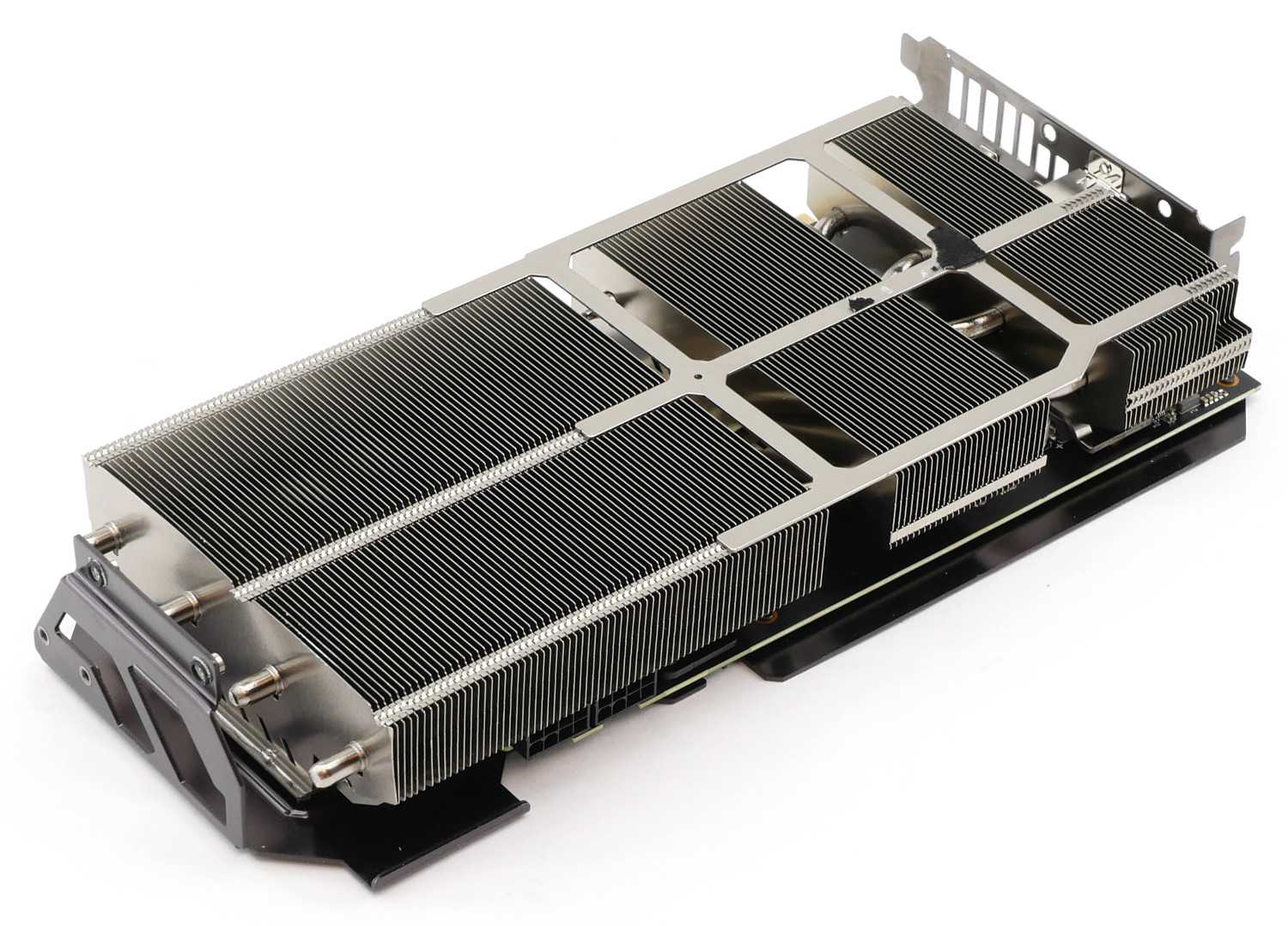 Под кожухом с вентиляторами скрыт один из наиболее продуманных и толстых радиаторов на нашей памяти. Его толщина доведена с 1.5 до 2.3 слотов расширения, ребра увеличены и расширены, позволяя больше аккумулировать тепла.