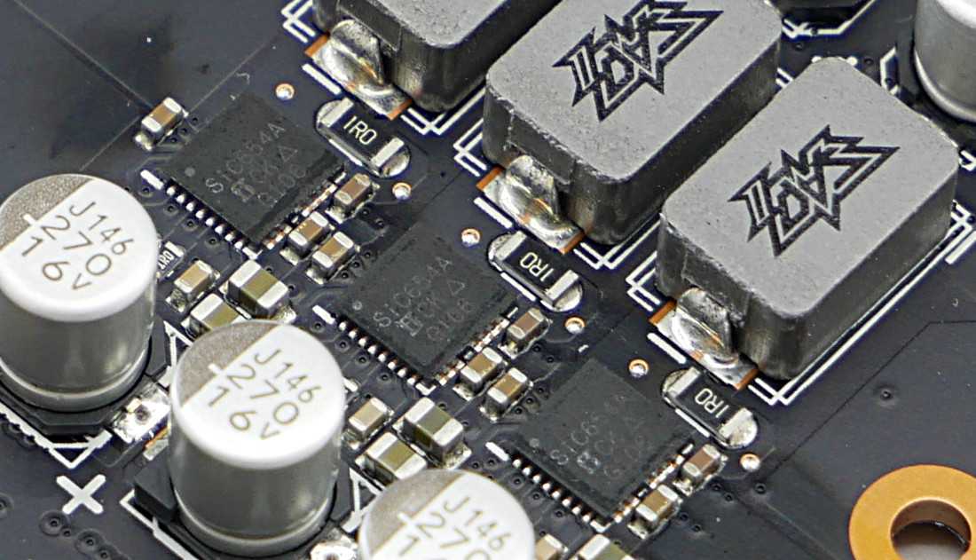В целом охладитель представлен трехсекционным радиатором, пронизанным пятью тепловыми трубками диаметром 6 мм и накрывающим основную линию мосфетов, графический процессор и микросхемы видеопамяти.