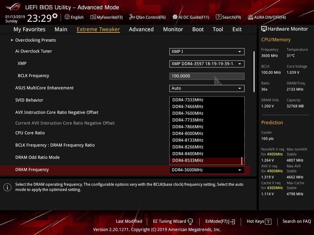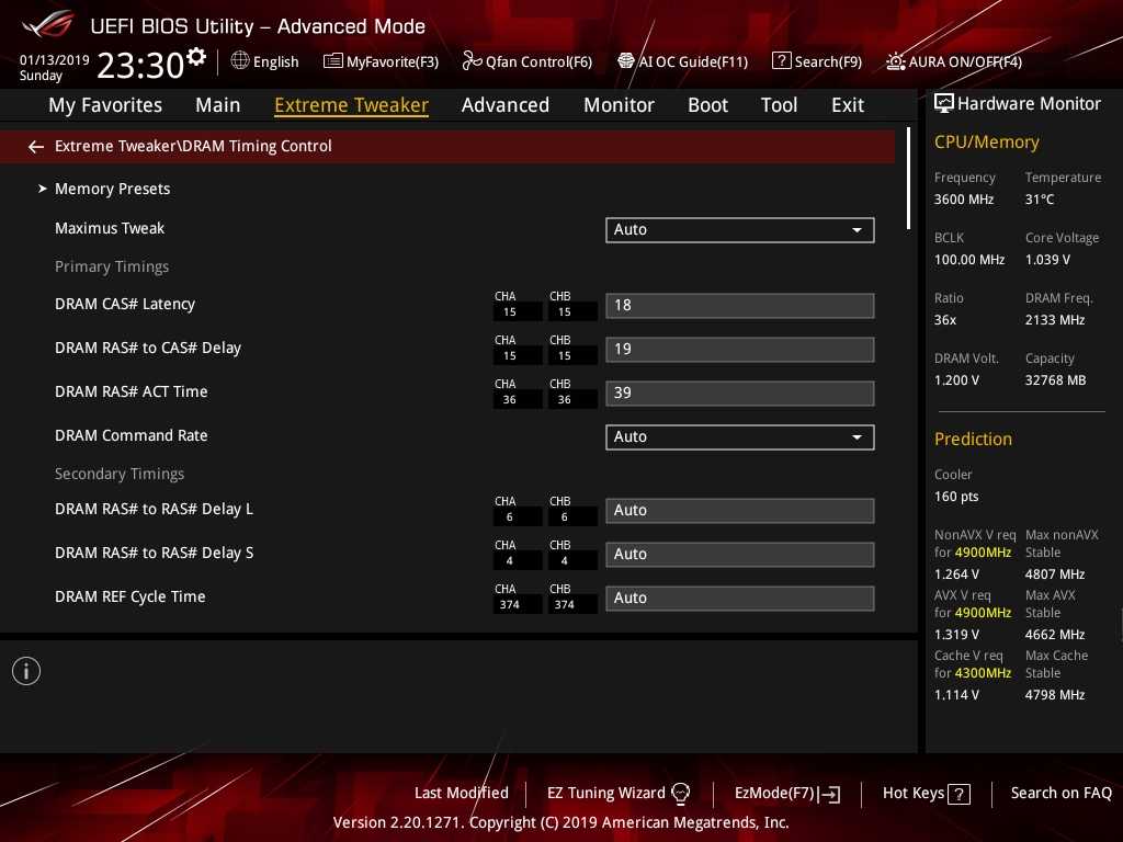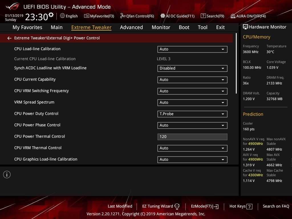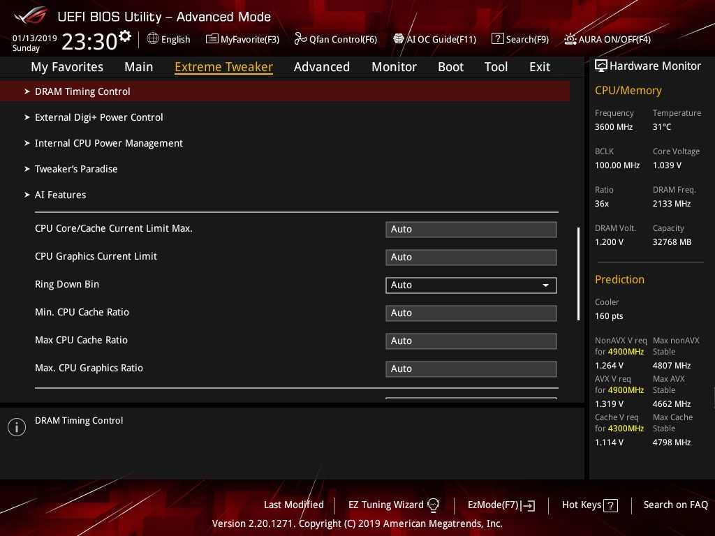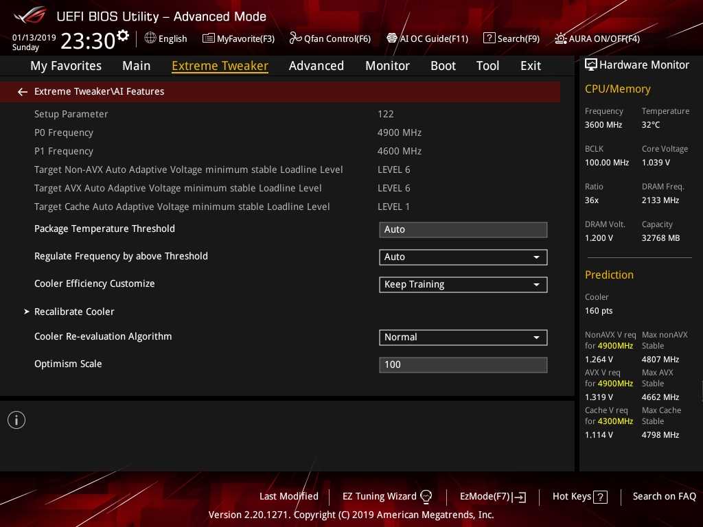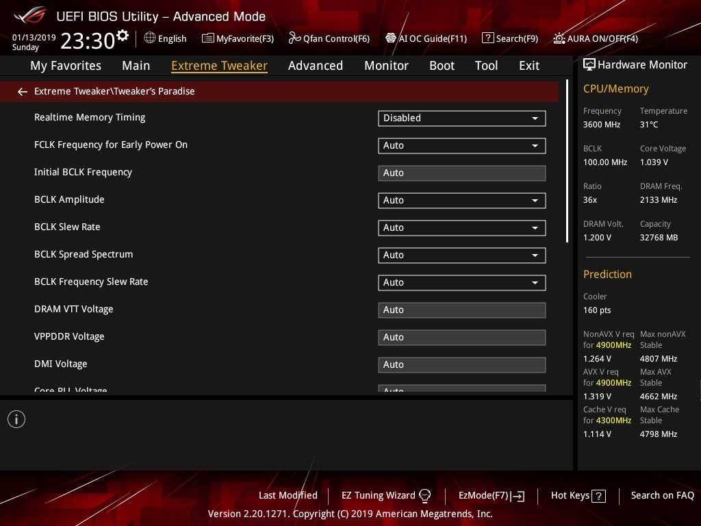 Представляющим наибольший интерес для владельца ROG Maximus XI Extreme является, конечно же, раздел «Extreme Tweaker». Из всей линейки материнских плат ASUS с чипсетом Intel Z390 модель ROG Maximus XI Extreme наиболее богата настройками оверклокерского характера. Здесь любители разгона найдут абсолютно все, что понадобится им для разгона системы.