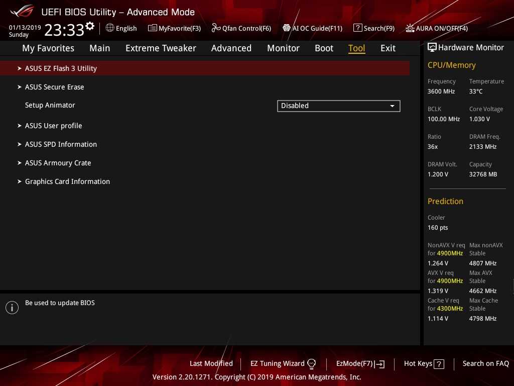 Перечень настроек в разделе «Tool» включает в себя обновление BIOS, чтение информации об установленных модулях памяти и плат расширений, работу с пользовательскими профилями, а также сервис для форматирования накопителей.