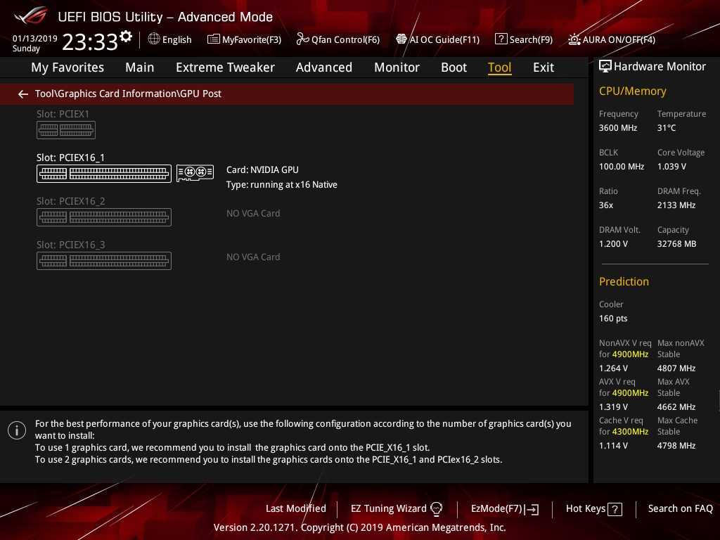 GPU/DIMM POST is one of those features whose benefit usually will be seen in the most stressful times like when something is not working. We actually wound up using this feature without intention on a previous ROG review, when a 32GB memory kit we were testing only showed up as 24GB. As we entered the BIOS after several attempts to fix the problem, we checked the GPU/DIMM POST and found that 2 modules were reading as “abnormal”. Powering the system off and resetting those DIMMs remedied the issue, but seeing that info directly in the firmware can save a lot of time when diagnosing errant behavior or instability; this kind of information being readily available is an invaluable asset to users. Additionally, the GPU POST option allows us to see the installed GPU’s in each slot, so that when benching LN2 or even on a liquid cooled gaming rig, the GPU POST screen can be checked to ensure identification of all installed cards is accomplished. See the BIOS Section for more info.