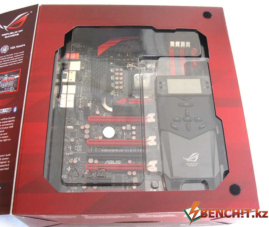 Цвета материнской платы по сравнению с предшествующими моделями не изменились. Традиционно Maximus V Extreme выкрашена в красные и черные цвета. По размеру ASUS Maximus V Extreme крупнее обычных материнских плат ATX. Она относится к форм-фактору E-ATX, поэтому перед покупкой мы рекомендуем убедиться, что ваш корпус способен вместить подобную материнскую плату.