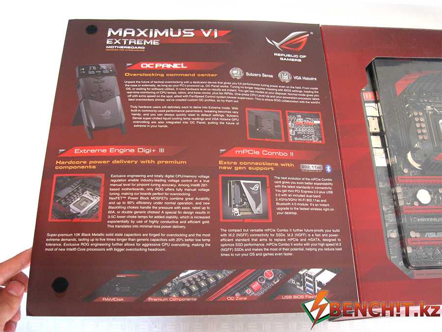 А вот вся информация о плате расписана под крышкой и на обратной стороне упаковки. Например, есть подробное описание OC Panel, системы питания, mPCIE Combo II и других ключевых аспектов.