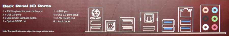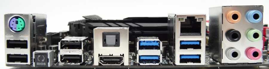 Задняя панель содержит восемь разъемов USB, половина из которых USB 3.0 (помечены синим цветом). Есть универсальный разъем PS/2 для клавиатуры и мыши, рядом с которым присутствует кнопка сброса настроек биоса. Из видеовыходов есть разъем HDMI версии 1.4. Шесть звуковых разъема 3,5 Jack сосредоточены единым блоком, также имеется оптический аудиовыход. Для подключения сети присутствует 1000Мбит/с порт Ethernet.