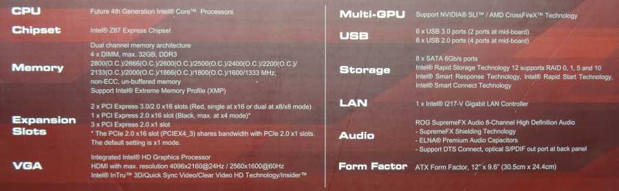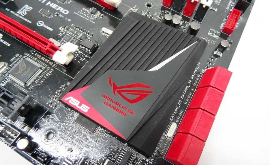 Сердце материнской платы — чипсет Z87 спрятан под массивным алюминиевым радиатором, выкрашенным в цвета серии Republic of gamers: черный цвет, с красными вставками.