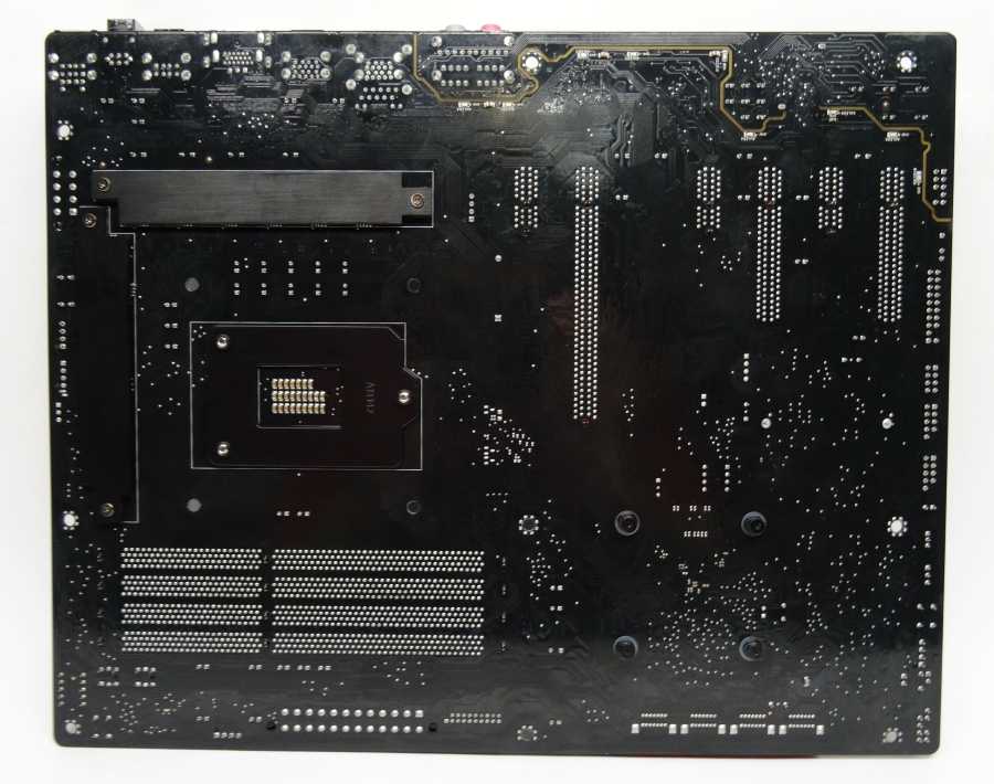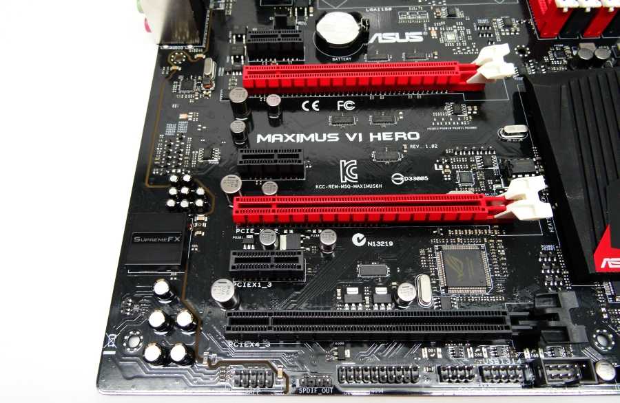Из слотов расширения присутствуют три слота PCIx1, и три слота PCIx16. Слоты, выделенные красным цветом, предназначены по умолчанию для установки видеокарт. Первый слот будет работать как PCIx16 при установке одной видеокарты. При установке двух видеокарт первый и второй слоты будут работать уже как PCIx8. Третий же слот всегда будет работать как PCIx4. Схему работы слотов можно легко определить по распайке с другой стороны материнской платы.