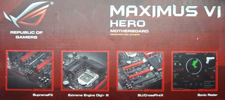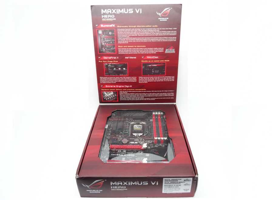Asus Maximus VI Hero поставляется в большой картонной коробке темно-красного цвета.