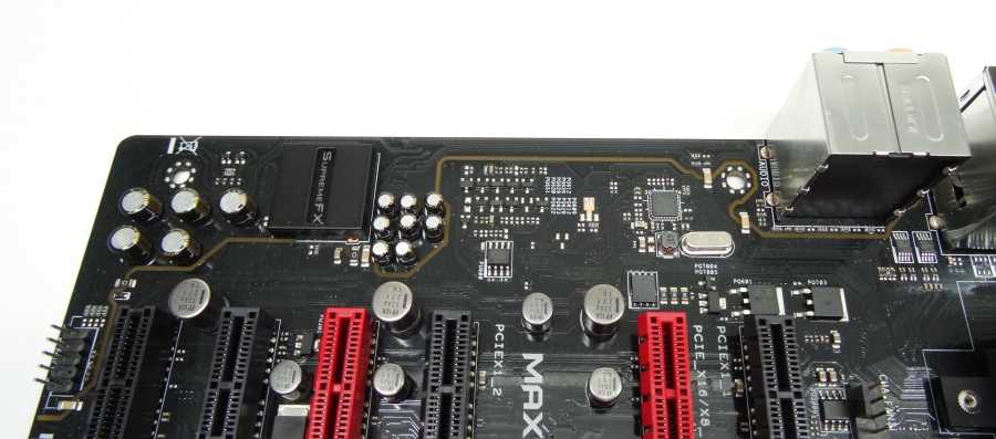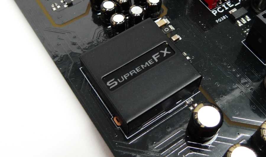 Аудио процессор Realtek закрыт сверху пластиковым корпусом с надписью SupremeFX, которая также светится во время работы красным цветом.