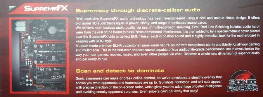 На внутренней откидной части коробки присутствует информация о примененных в данной плате фирменных технологиях ASUS SupremeFX и SonicRadar. Sonic Radar – технология, призванная дать возможность визуализации всех источников звука в компьютерных играх, причем даже тех звуков, которые находятся вне пределов видимости игрока. Как известно, у ASUS есть свое подразделение, которое занимается разработкой звуковых устройств, и именно наработки этого подразделения были использованы при реализации данной технологии. Sonic Radar можно задействовать со звуковыми картами серии ROG (включая Xonar Phoebus и Xonar Phoebus Solo) и материнскими платами серии Maximus VI с аудиопроцессором SupremeFX.