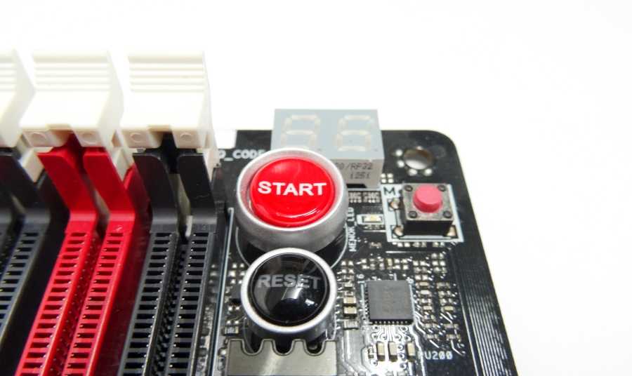 Рядом с модулями памяти присутствуют две удобные кнопки START и RESET, а также двух-символьный индикатор POST кодов. Все эти возможности удобно использовать в том случае, если у вас собран открытый тестовый стенд.