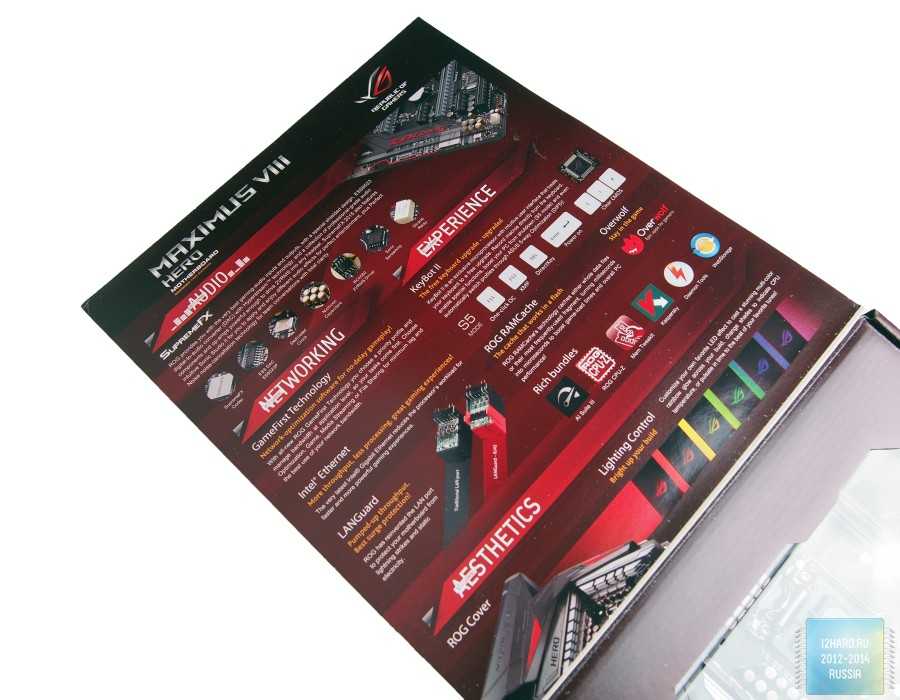 Откидная картонная крышка с внутренней стороны являет собой и информационную полезную составляющую, поскольку именно здесь производитель рассказывает о фирменных технологиях, присутствующих в ASUS Maximus VIII Hero.