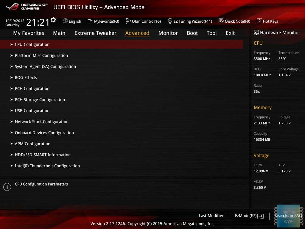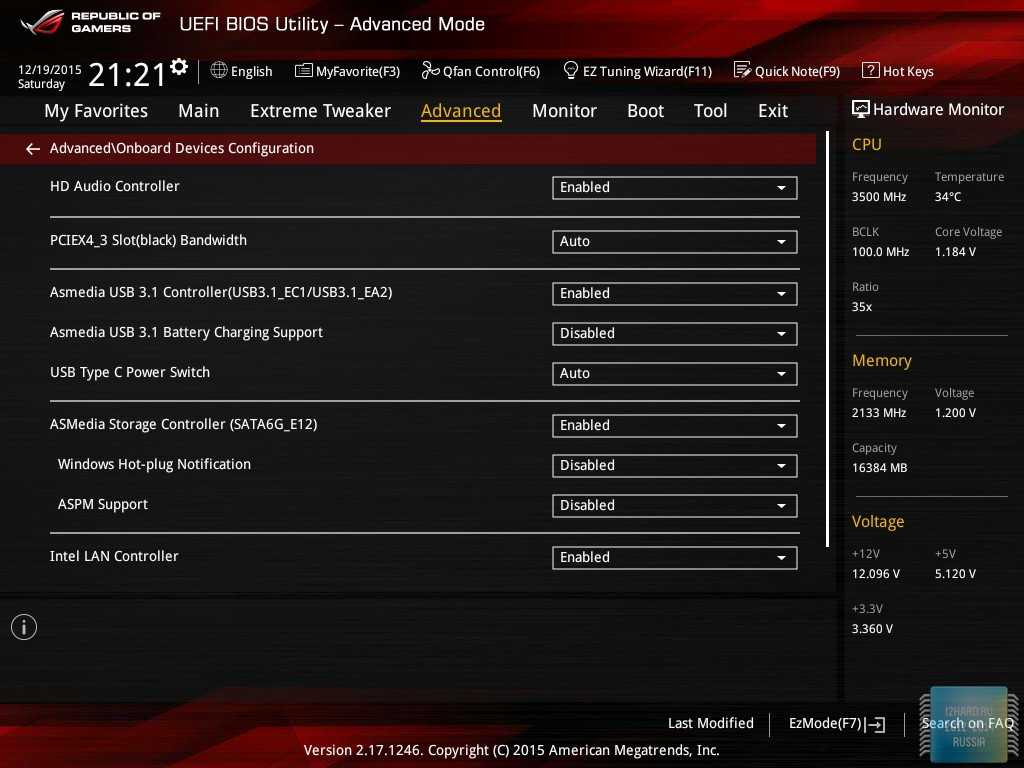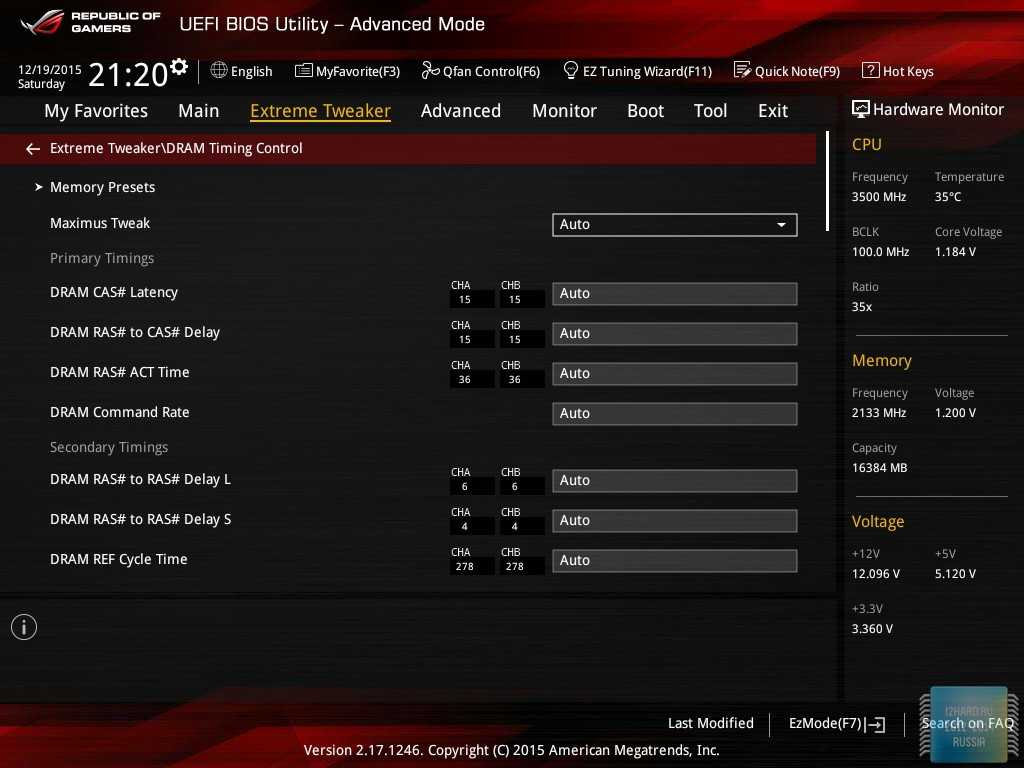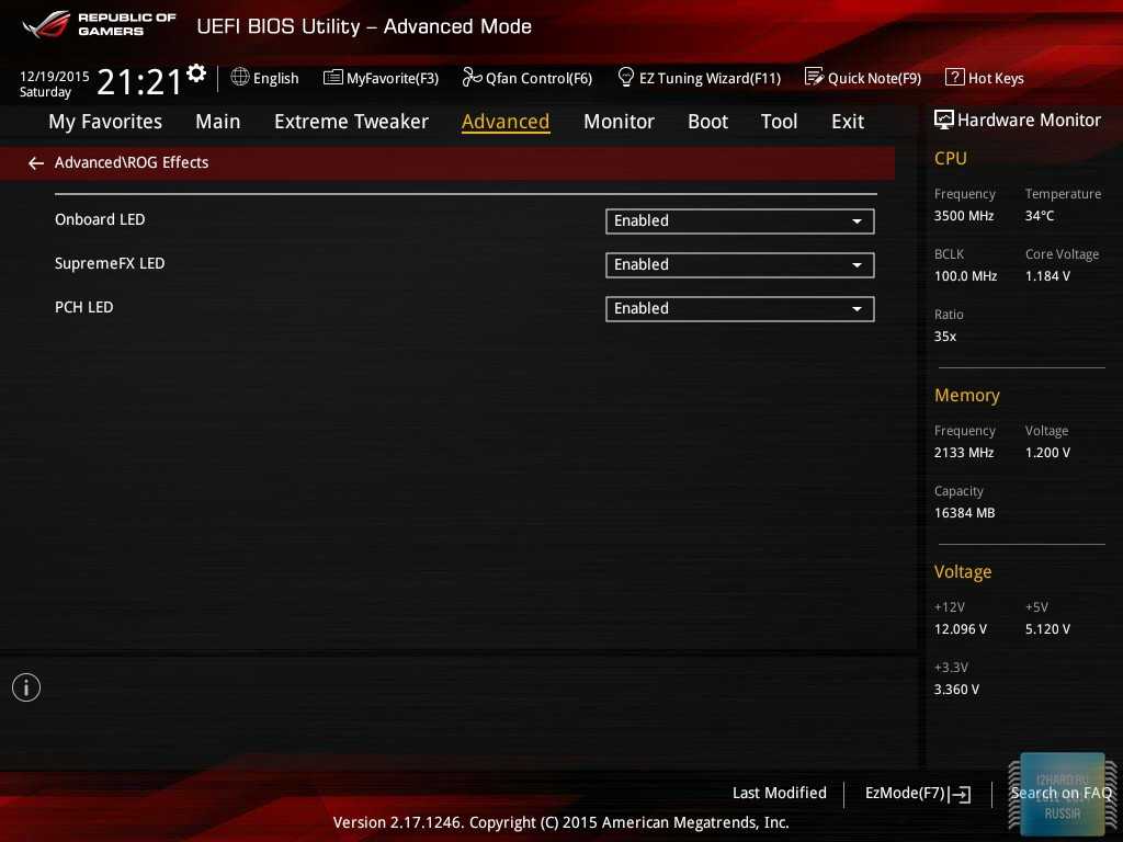 Перед началом тестирования BIOS материнской платы ASUS Maximus VIII Hero был обновлен до последней версии 1202 от 10.11.2015. В качестве тестового процессора был использован Intel Core i5-6600k с тактовой частотой 3.5 ГГц. Настройки в BIOS материнской платы были установлены по умолчанию.