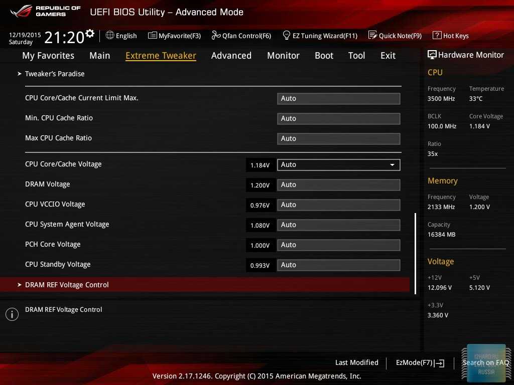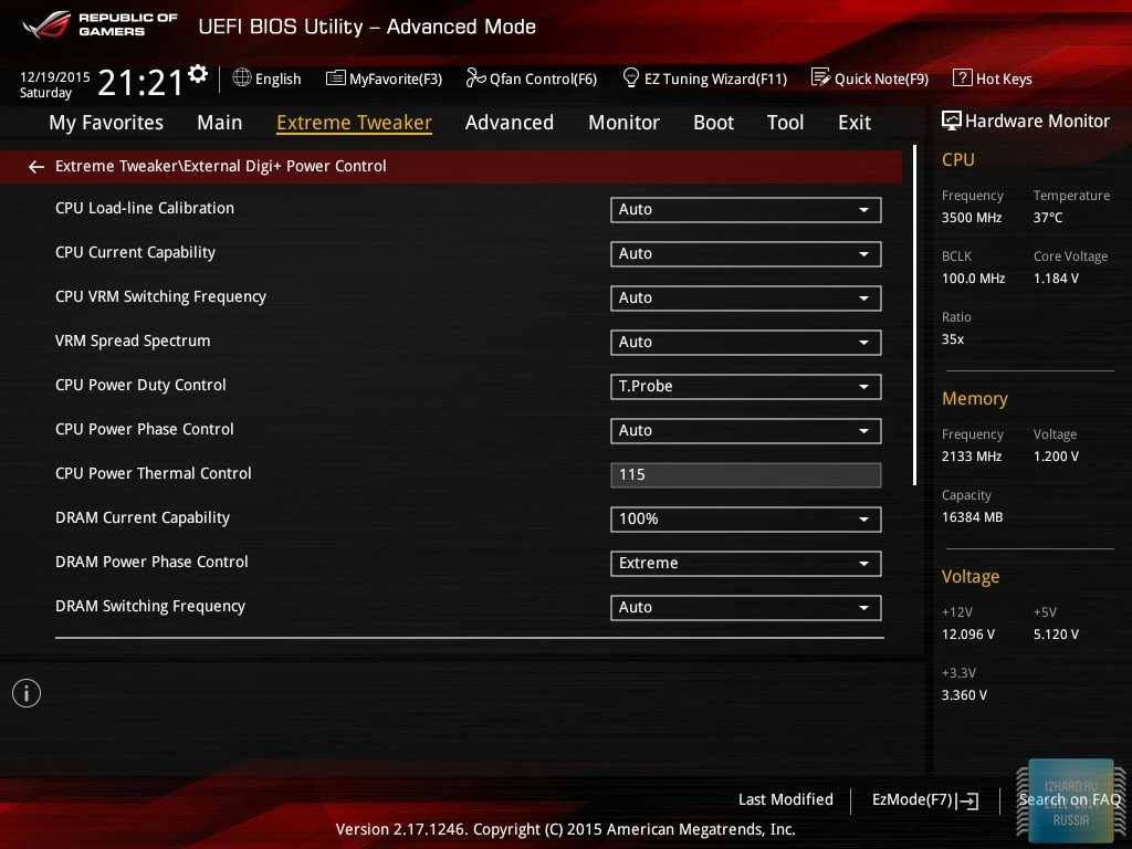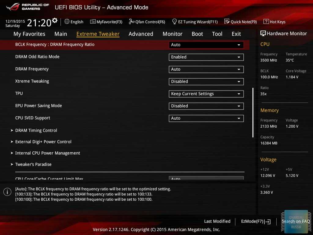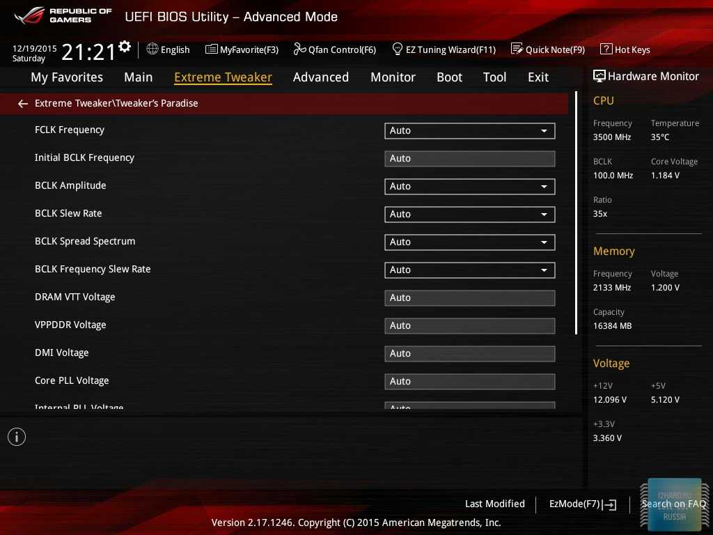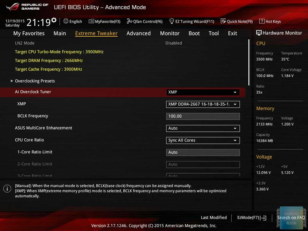 Во вкладке Extreme Tweaker собраны все необходимые настройки для разгона и тюнинга системы для увеличения производительности. Здесь также присутствует возможность активации профилей XMP, а также полноценный набор инструментов для тонкого разгона, как процессора, так и оперативной памяти. Поддерживается не только изменение таймингов памяти, но и управлением напряжением на различные компоненты системы.