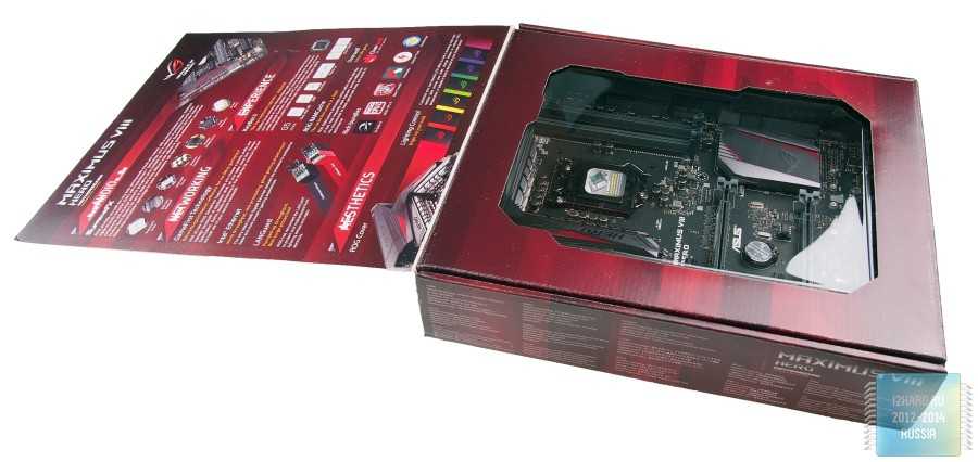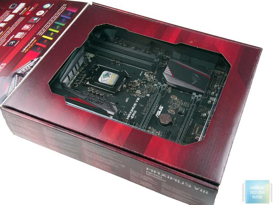 Являясь премиумным продуктом, плата ASUS Maximus VIII Hero упакована в коробку с двойной крышкой и прозрачной внутренней стенкой, благодаря которой можно рассмотреть плату через пластиковый блистер, не вскрывая до конца саму упаковку. Подобная откидная стенка для продуктов ASUS уже не в диковинку, и присуще, как правило, только топовым моделям.