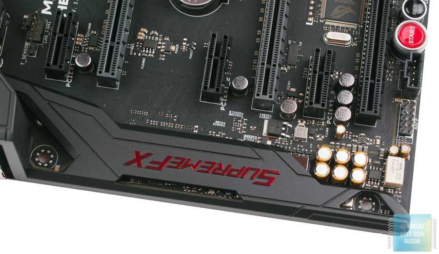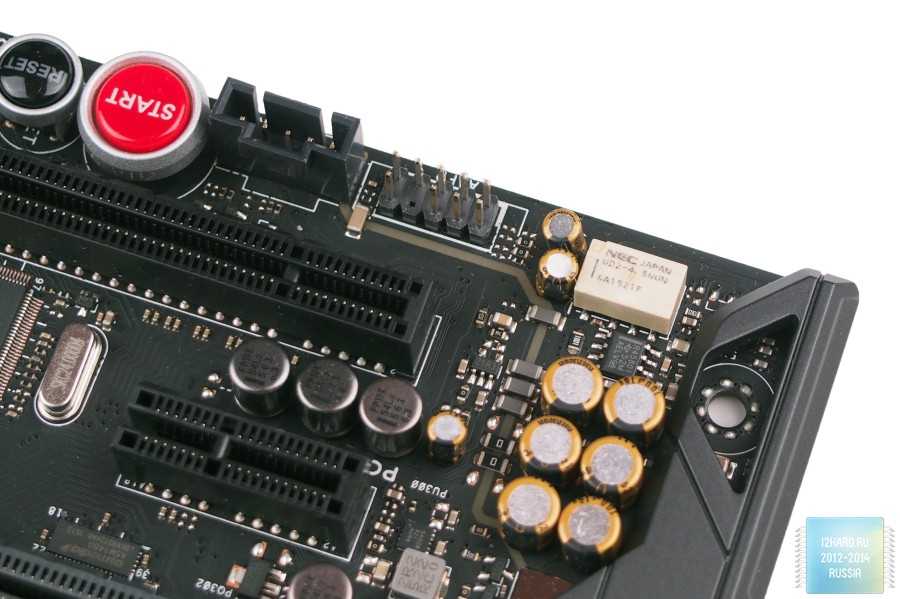 Большая часть звуковых компонентов на плате ASUS Maximus VIII Hero прикрыта пластиковым кожухом, на котором красуется надпись SupremeFX. Так обозначается предустановленный на плате аудиокодек с поддержкой восьмиканального звука с центральным аудиопроцессором ESS ES90232P, аудиоконденсаторов Nichicon и усилителя TI R4580I.