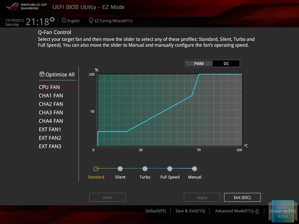 Помимо этого в заглавном меню EZ Mode доступна настройка работы вентиляторов с помощью инструмента QFan Control. Возможно управление каждым отдельным вентилятором по пяти отдельным контрольным точкам.