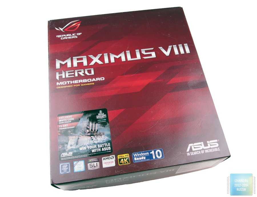 Как и подобает платам серии Republic of Games, упаковка рассматриваемой модели ASUS Maximus VIII Hero выполнена в классическом темно-красном окрасе. Подобная стилистика и оформление продуктов данной серии у компании ASUS присутствует достаточно давно, благодаря чему эта продукция является узнаваемой среди множества других девайсов. Основная часть лицевой коробки содержит название модели материнской платы, а также наклейку с информацией о 15-дневном премиум-аккаунте к игре World of Warships. Пиктограммы в нижней части коробки означают поддерживаемые технологии и стандарты, среди которых особый акцент сделан на совместимость с Windows 10.