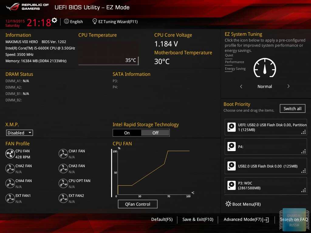 Настройки BIOS материнской платы ASUS Maximus VIII Hero максимально приветливы как для начинающих, так и для продвинутых пользователей. Основой прошивки является EZ Mode режим, в котором собрана самая основная информация о системе, включая основные показатели температур, частот, напряжений и скорости вращений вентиляторов. Здесь же предусмотрена возможность выбора загрузочного устройства, настройка даты и времени, а также активация профилей XMP.