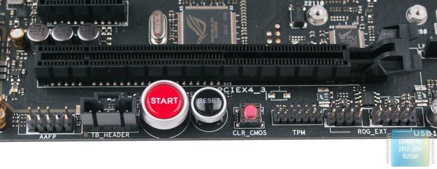 На нижней грани платы удобные органы управления найдут оверклокеры и любители открытого тестового стенда. Это кнопки Power и Reset, а также кнопка сброса настроек BIOS.