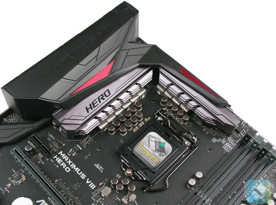 Основная деталь, к которой производитель сосредоточил все внимание, придав столь причудливые формы радиаторам и кожуху – это процессорный разъем. Плата ASUS Maximus VIII Hero поддерживает любые 14-нм процессоры семейства Skylake c разъемом LGA1151, включая модели с разблокированным множителем