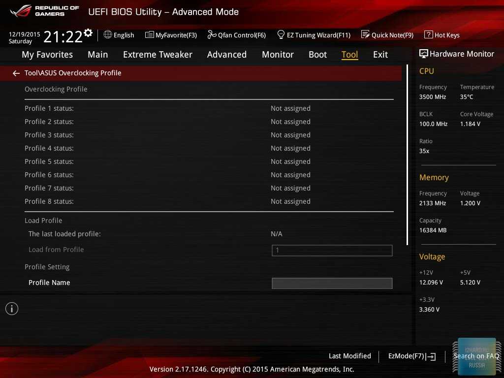 Вкладка Tool содержит в основном утилиты и сервисы для технического обслуживания и мониторинга материнской платы. Так, с помощью настроек данного раздела пользователь может обновить прошивку BIOS, отформатировать накопители, сохранить и загрузить желаемые профили настроек, а также получить информацию об SPD модулей памяти и установленных в PCI-E слоты устройствах.