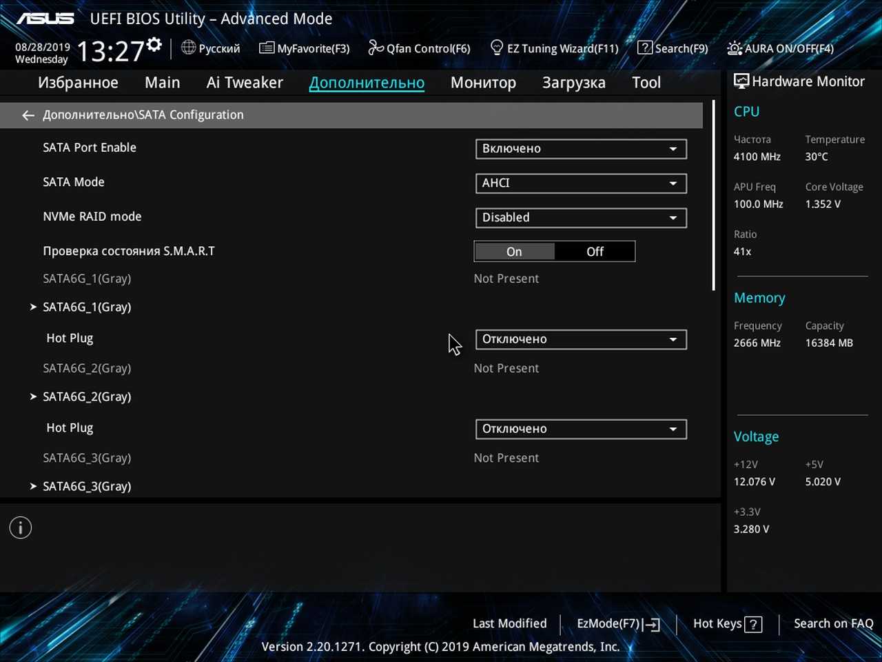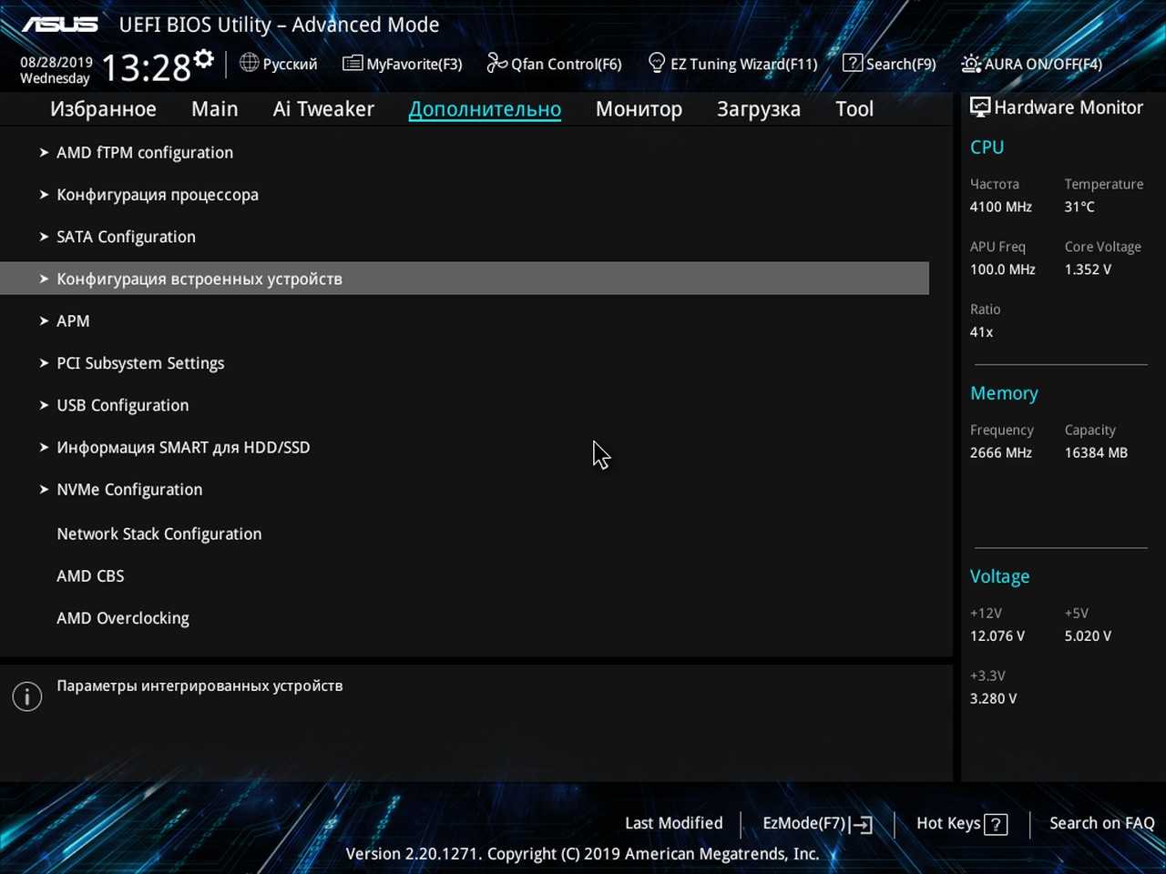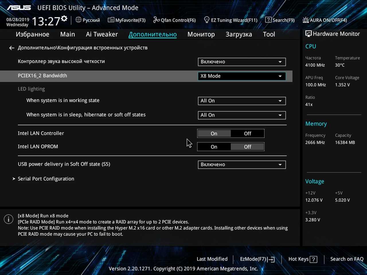 На вкладке «дополнительно» можно включать/отключать порты, настраивать SATA накопители, включить режим зарядки по USB при отключенном ПК. Здесь же мы можем отключать подсветку, контроллер LAN и звуковой кодек.
