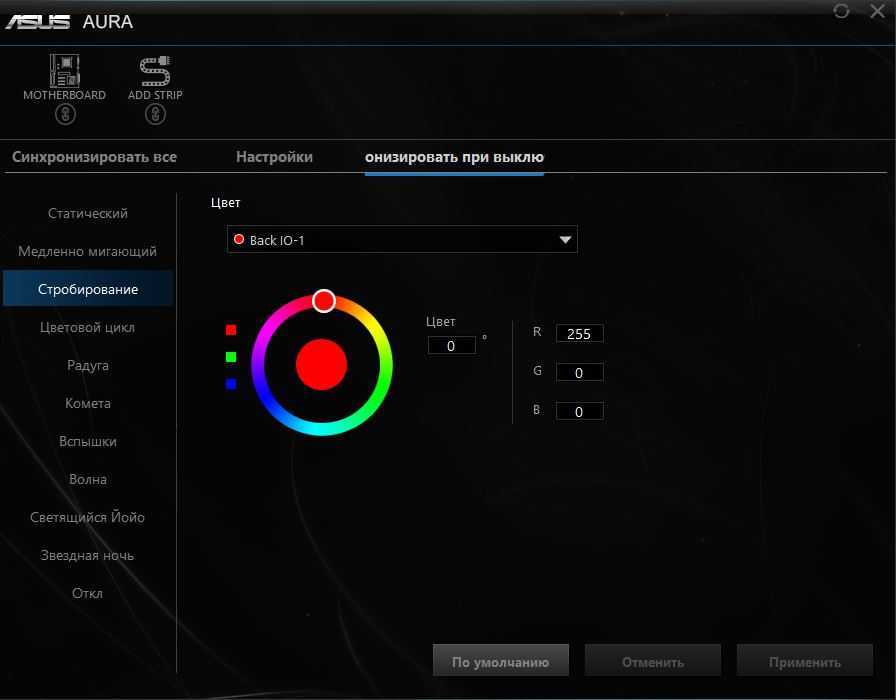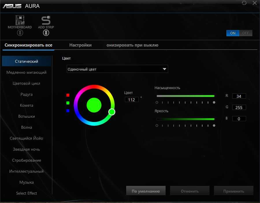 Также данная утилита имеет инструмент для настройки и синхронизации подсветки, который ранее отлично справлялся с другими материнскими платами на данном чипсете. Но Prime он не обнаружил, и в настройке подсветки нам помогла другая, более функциональная утилита Aura. Данная программа имеет больше предустановок, может настраивать каждую LED-ленту отдельно или синхронизировать их.