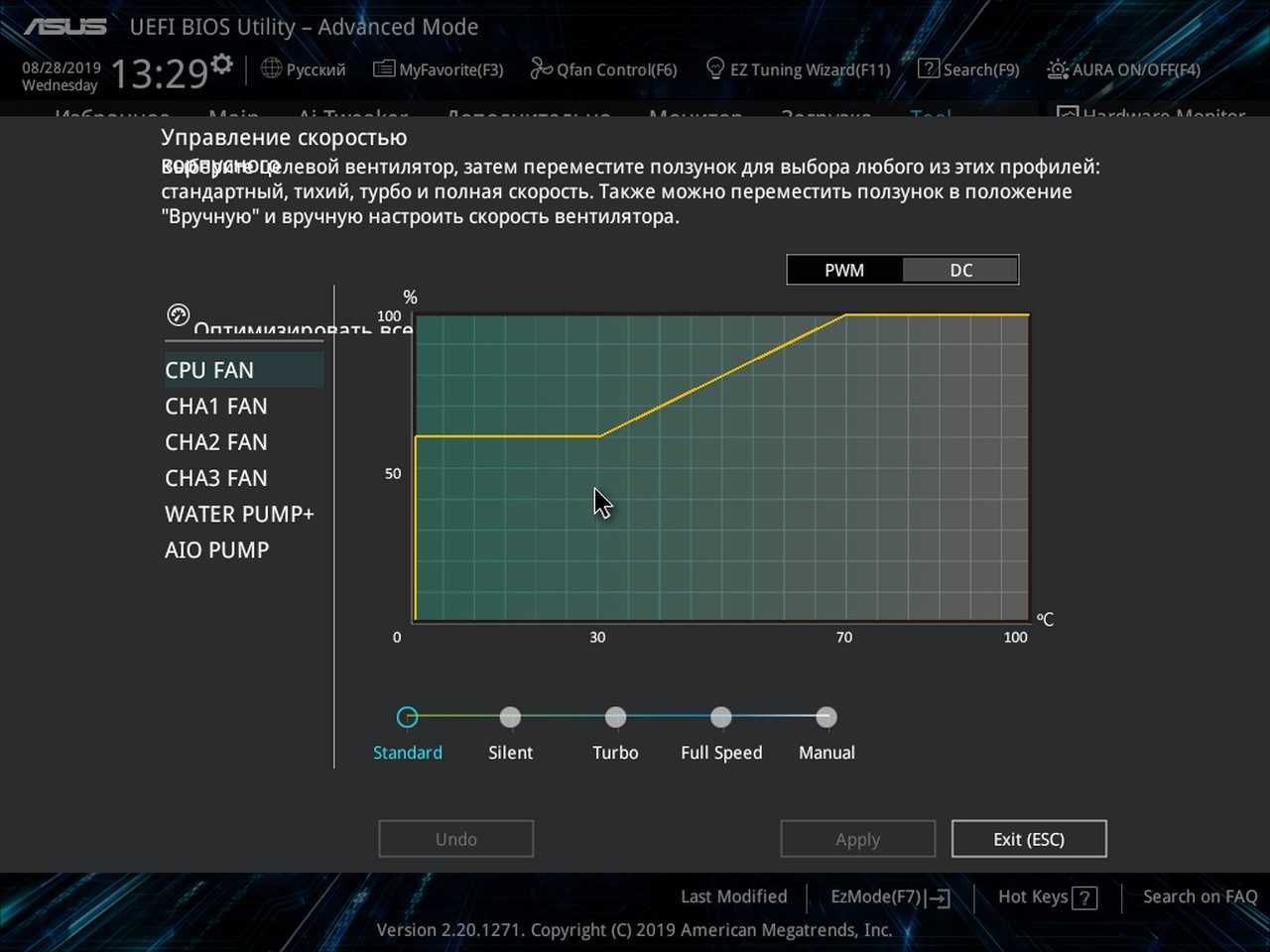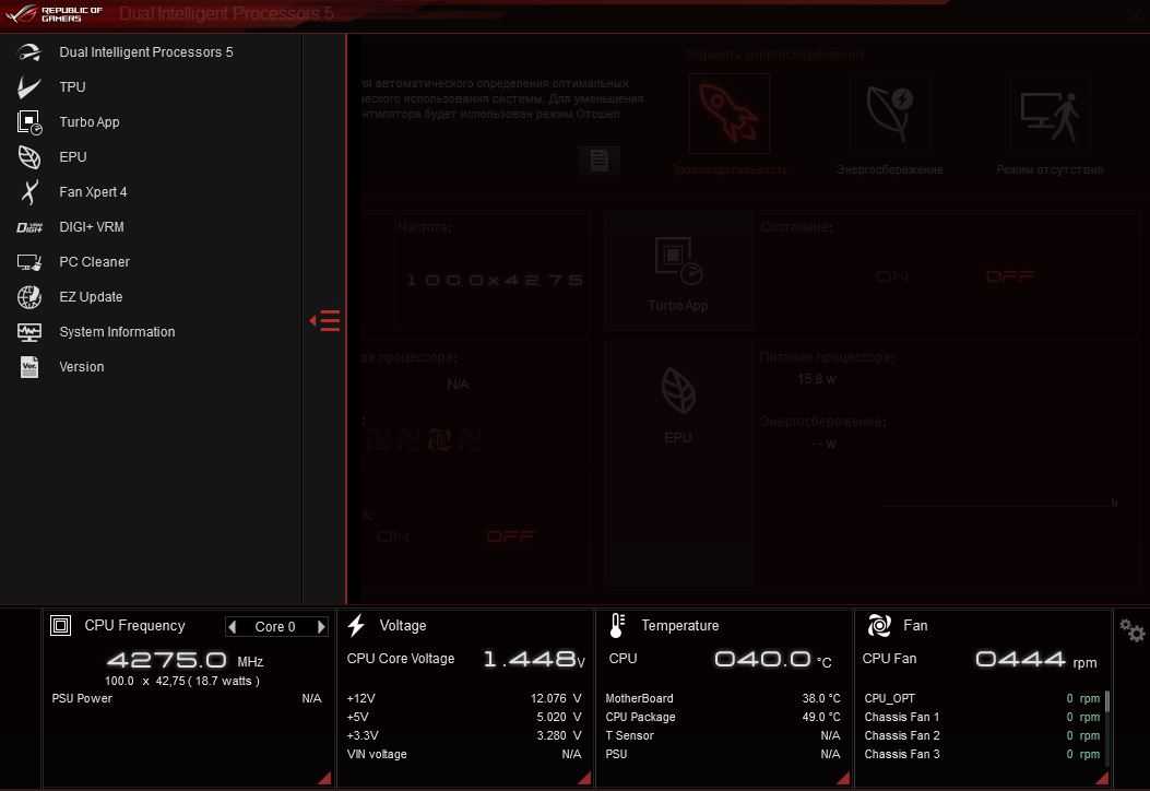 Все прочие настройки материнской платы и ее мониторинг возможны в программе Al Suite III. Для автоматического разгона и тестирования процессора используется утилита Dual Intelligent Processor 5. Также в ней мы настраиваем обороты подключенных вентиляторов. Все настройки делаются для трех профилей: производительный, энергосберегающий и отсутствие. Миниатюрное анимированное меню в панели управления позволяет оперативно переключаться между настроенными режимами без запуска самой утилиты.