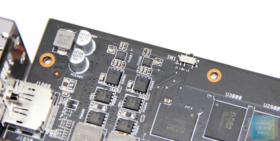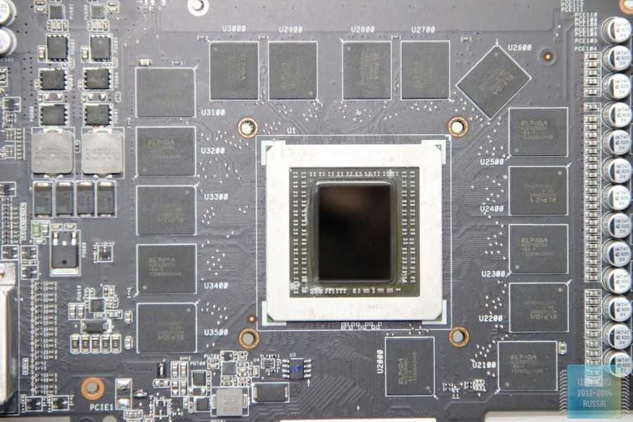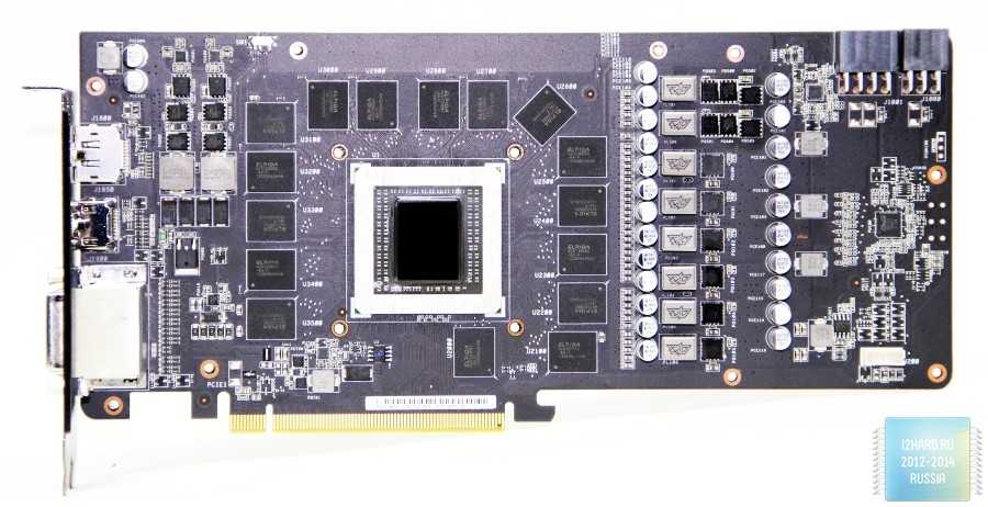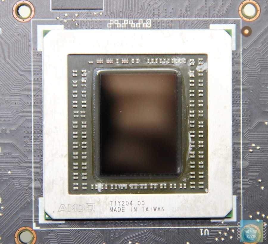 Отказ производителя разместить часть чипов памяти на тыльной стороне печатной платы внес свои коррективы в плотность их расположения на лицевой части. Микросхемы памяти вокруг AMD Hawaii расположены практически по кругу, а их монтаж выполнен очень плотно друг к другу.