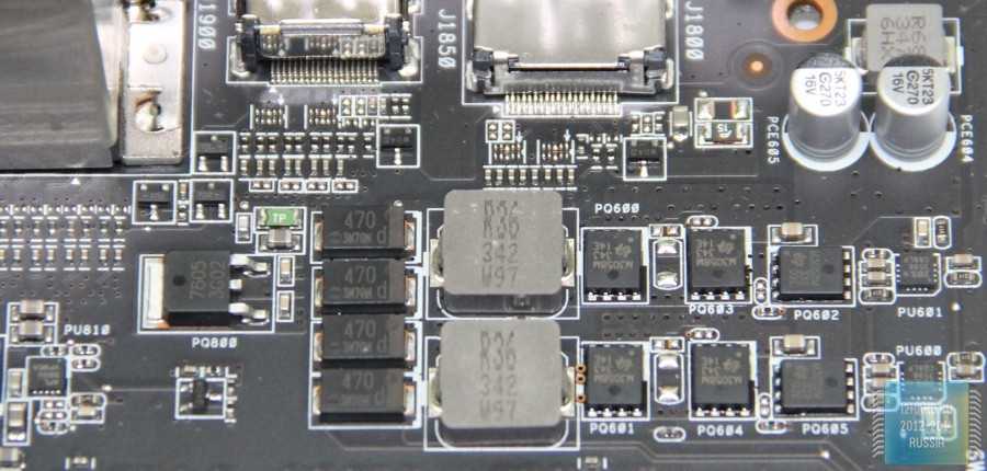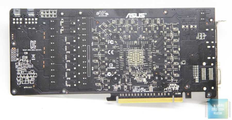 Несмотря на внушительные габариты печатной платы, навесные элементы на ASUS Radeon R9 290 OC расположены очень плотно. Таким плотным расположением элементов ASUS Radeon R9 290 OC обязана в первую очередь большими размерами графического процессора, большим количеством микросхем памяти, а также сложной системой питания.