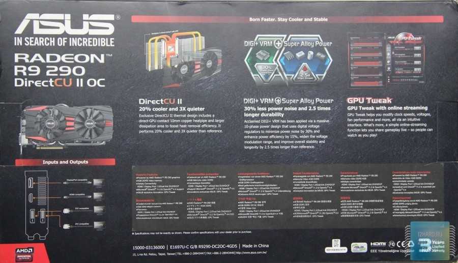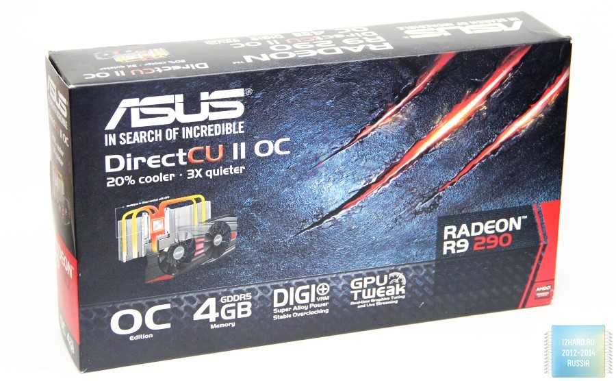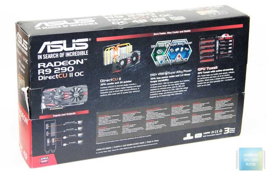 Являясь представителем числа высокопроизводительных решений, видеокарта ASUS Radeon R9 290 OC поставляется в коробке исполинских размеров. Повышенные частоты, набортная память 4Гб, цифровое управление питанием DIGI+ VRM и программное обеспечение GPU Tweak — это далеко не полный список основных технических особенностей видеокарты, которые производитель разместил на упаковке своего продукта.