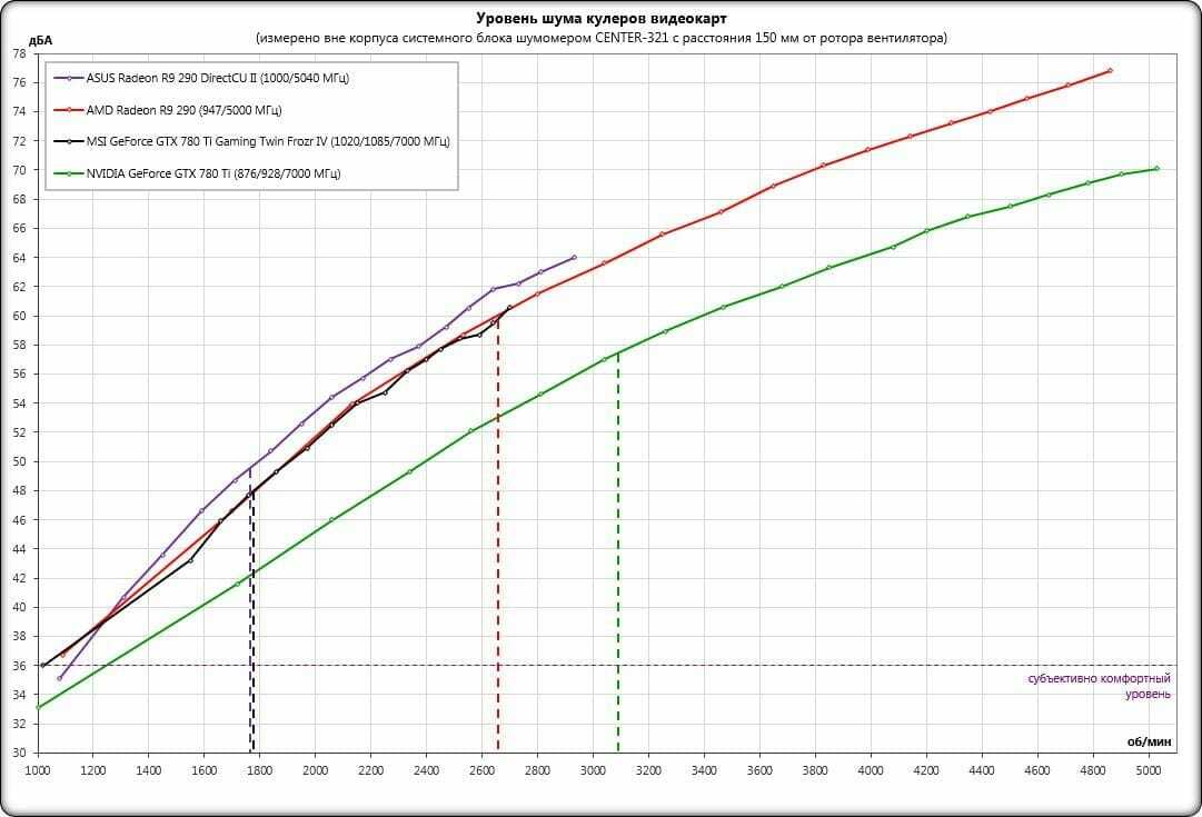 We’ll compare the noise level of the ASUS Radeon R9 290 DirectCU II with that of the reference R9 290 from AMD. We also include the results of the Nvidia GeForce GTX 780 Ti and the original MSI GeForce GTX 780 Ti Gaming for the sake of comparison. The vertical dotted lines mark the top speed of the fans in the automatic regulation mode. Here are the results: