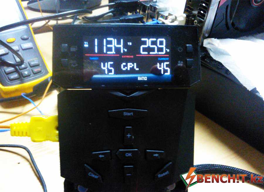 Например, на фотографии ниже, вы можете увидеть, что OC Panel показывает температуры -113.4 и 25.9 градусов Цельсия для первой и второй термопар соответственно, а множитель процессора равен 45-ти.