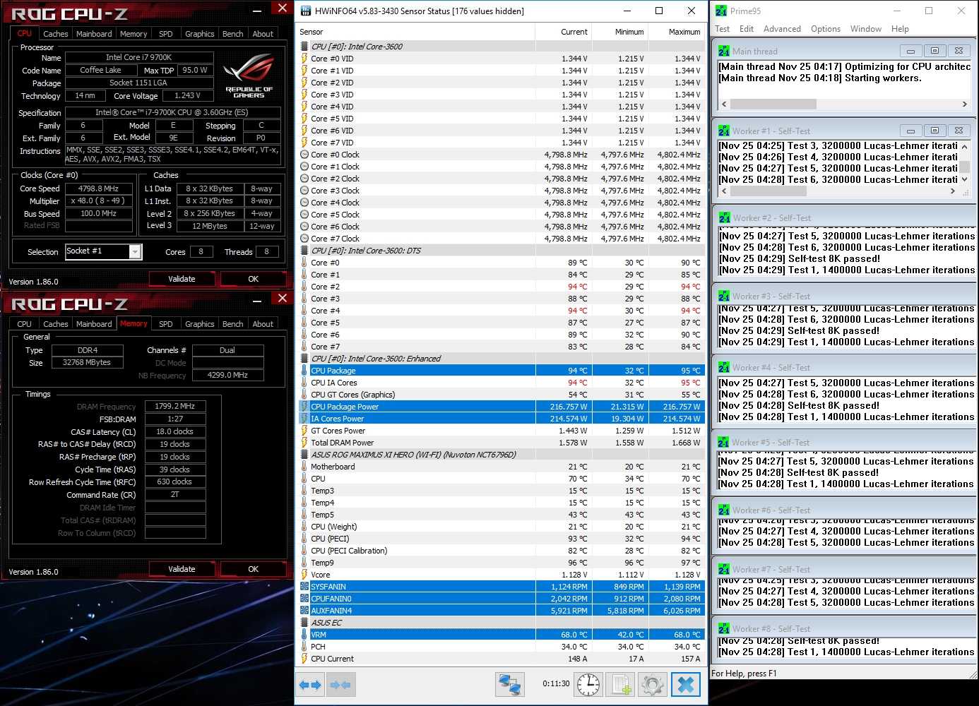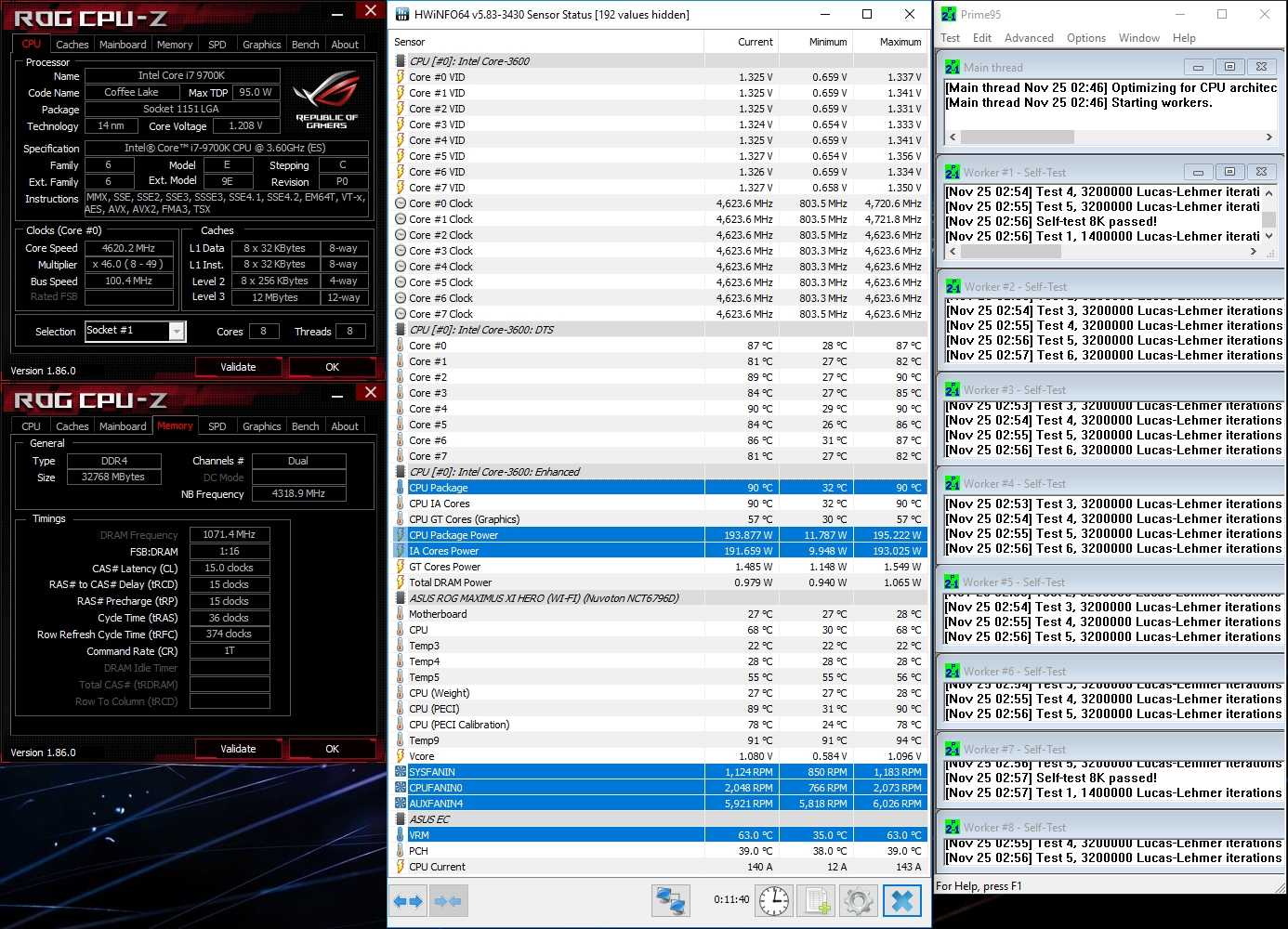 Эксперименты с ROG Maximus XI Hero (WI-FI) начались с настройками BIOS по умолчанию. Это необходимо для того, чтобы посмотреть, как материнская плата выставляет напряжение на ядра процессора во время нагрузки, и насколько они отличаются в меньшую или большую сторону. Для создания нагрузки на все 8 ядер процессора Intel Core i7-9700k была использована программа Prime95 с AVX инструкциями, в качестве мониторинга показателей использовалась утилита HWiNFO64. Наш тест показал, что при полной нагрузке плата ROG Maximus XI Hero (WI-FI) завышает напряжения на ядра процессора, вследствие чего Intel Core i7-9700k потребляетпостоянно 195 Вт энергии. При столь высоком потреблении температура самого горячего ядра процессора составляет внушительные 90 градусов Цельсия. Это не критично для самого процессора, но очень высокие требования для системы охлаждения. При том, что процессор мы еще даже не разгоняли.
