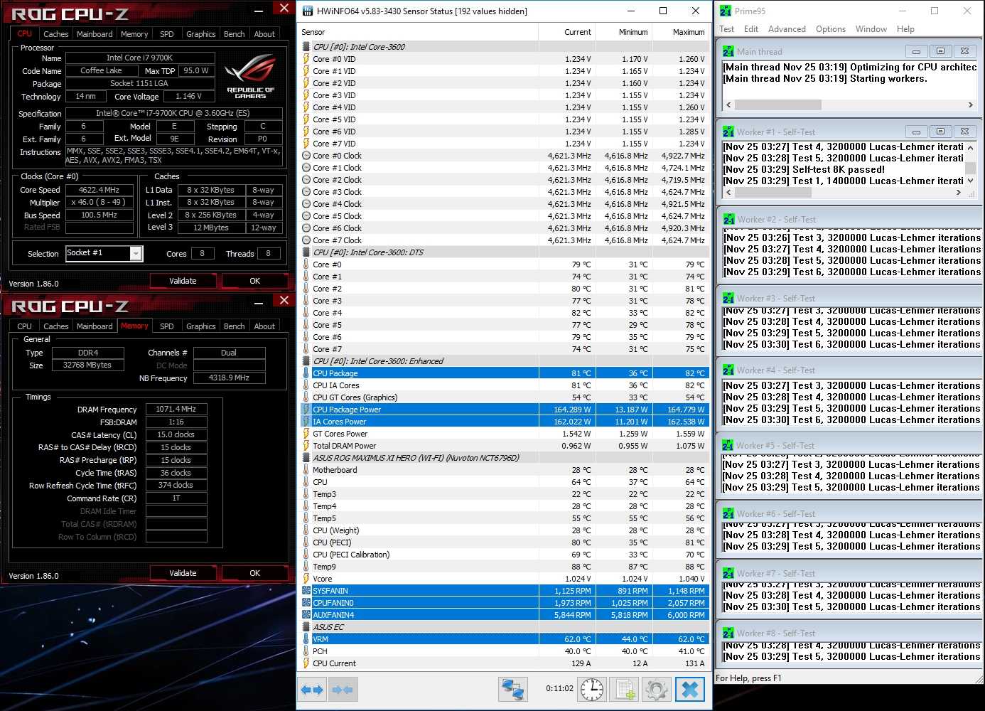 Следующим нашим шагом была попытка взять контроль над напряжением, подаваемым на CPU. В настройках BIOS платы ROG Maximus XI Hero (WI-FI) мы выставили вручную значение CPU Load-Line Colibration — Level 8, а напряжение установили на 1.15 В. Вернувшись к тестам под нагрузкой, мы увидели, что рабочее напряжение ядер упало с 1.324 В до 1.234 В, а потребление процессора Intel Core i7-9700k снизилось до 165 Вт. Уже в этих условиях нагрев процессора составил максимальные 82 градуса Цельсия.