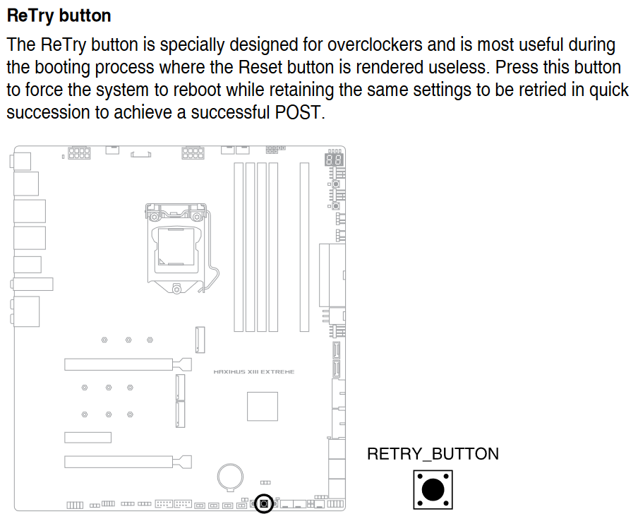 Иногда в процессе разгона и тестов процессора система зависает так сильно, что кнопка RESET не оказывает на неё никакого действия. В данном случае можно выключить блок питания или нажать на клавишу ReTry button, которая позволяет перезагрузиться и сохранить настройки, при которых BIOS прошёл процесс самотестирования (POST).