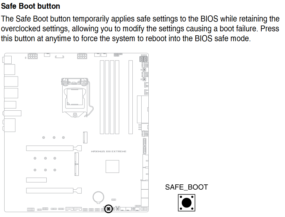 Иногда во время разгона система отказывается загружаться. В таких случаях приходится сбрасывать BIOS и настраивать всё с нуля – если профили рабочих настроек не были сохранены ранее. В процессе разгона подобные ситуации могут встречаться часто и на перезагрузки с подбором настроек может уйти много времени. Чтобы сберечь время оверклокеров, на материнской плате распаяна клавиша Safe Boot, которая поможет загрузить систему с предыдущими успешными настройками.
