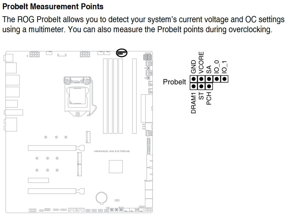 Экстремальный разгон не проходит без снятия основных напряжений напрямую с материнской платы. Для удобства оверклокеров производитель предусмотрел набор точек ProbeIt, к которым можно подключить щупы мультиметра. Пользователи могут измерить напряжения памяти, чипсета, ядра процессора и других компонентов платы.