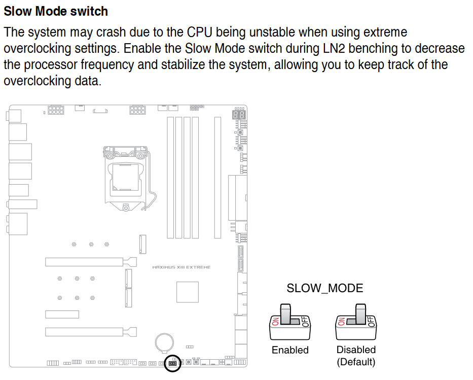 Если разгон пойдёт не по плану, то плату можно переключить в медленный режим работы с помощью переключателя Slow Mode. При его активации процессор начинает работать на низких и стабильных частотах, чтобы операционная система могла загрузиться.