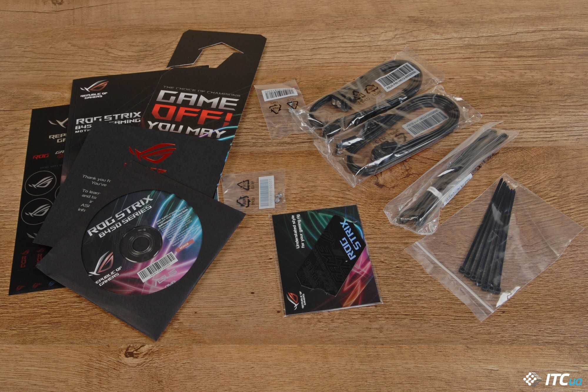 В комплекте с устройством поставляется руководство пользователя, диск с драйверами и ПО, четыре кабеля SATA, удлинитель для RGB-ленты, крепление для M.2-накопителей и набор пластиковых стяжек для аккуратной укладки силовых и интерфейсных проводников.