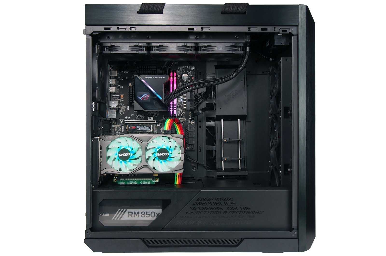 В качестве блока питания использовался модульный Corsair RM850x, который позволил задействовать только нужные кабели для сборки. Графический адаптер Inno3D GTX 1660 Super был установлен в вертикальное положение. На этом моменте стоит отметить, что райзер для видеокарты не входит в комплект поставки ROG Strix Helios, несмотря на немалую стоимость этого корпуса. Поэтому для сборки игровой системы в корпусе ROG Strix Helios мы использовали райзер PCIe x16, купленный отдельно.