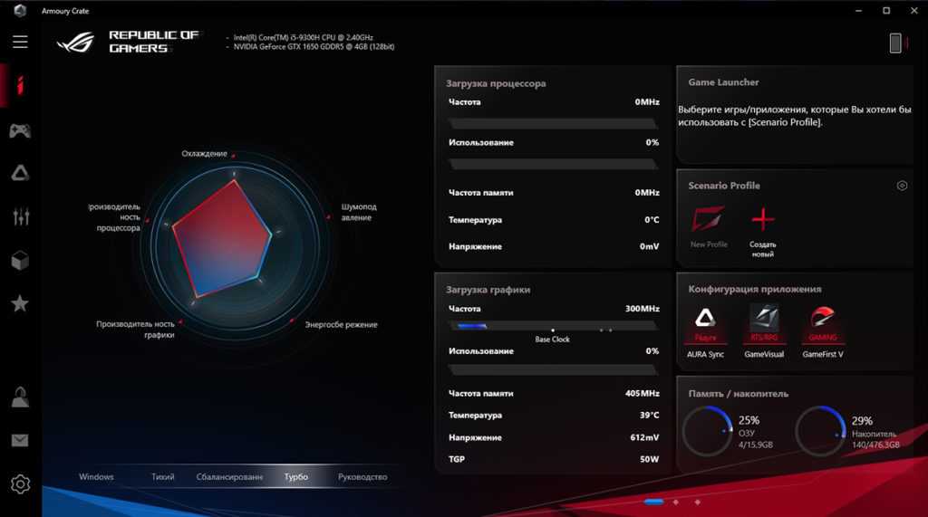 Играть лучше в самом мощном режиме «турбо» — его можно включить в официальной программке Armoury Crate. Режим задействует все ресурсы ноутбука для максимальной производительности и охлаждения. А для повседневных задач подойдут два других режима: «сбалансированный» и «тихий», которые делают тише работу кулеров и оптимизируют расход энергии, жертвуя производительностью. Хотя даже при самой интенсивной работе вентиляторов шумит ROG Strix G несильно.