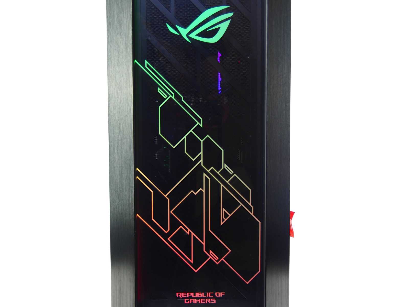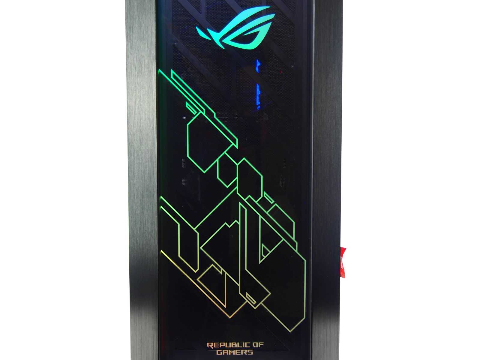 Фронтальная панель корпуса закрыта закалённым стеклом, с логотипом Republic of Gamers и светлым орнаментом. Лого, а также орнамент – единственные подсвечивающиеся элементы корпуса. Внутри него никакой подсветки не установлено по очевидным причинам. Чтобы пользователь, мог самостоятельно разместить светодиодные ленты в необходимых местах.