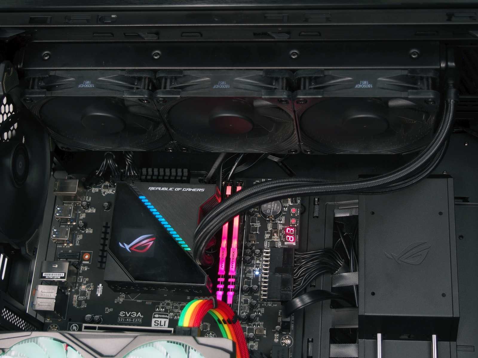 В качестве системы жидкостного охлаждения процессора мы использовали ASUS ROG Ryujin 360, радиатор которой закрепили на верхнюю панель корпуса ROG Strix Helios.