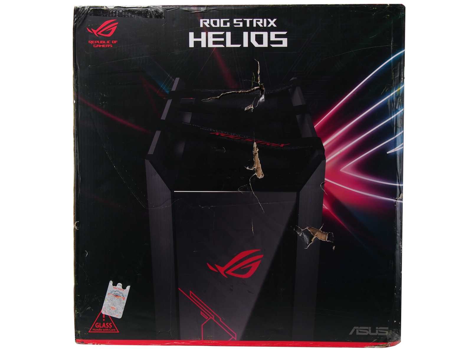 Корпус ROG Strix Helios поставляется в огромной картонной упаковке с габаритами 700 х 395 х 726 мм. Масса кейса вместе с упаковкой составляет примерно 19.5 кг. Для того, чтобы переноска такого габаритного и тяжелого корпуса была возможна, по бокам картонной коробки присутствуют отверстия в виде ручек.