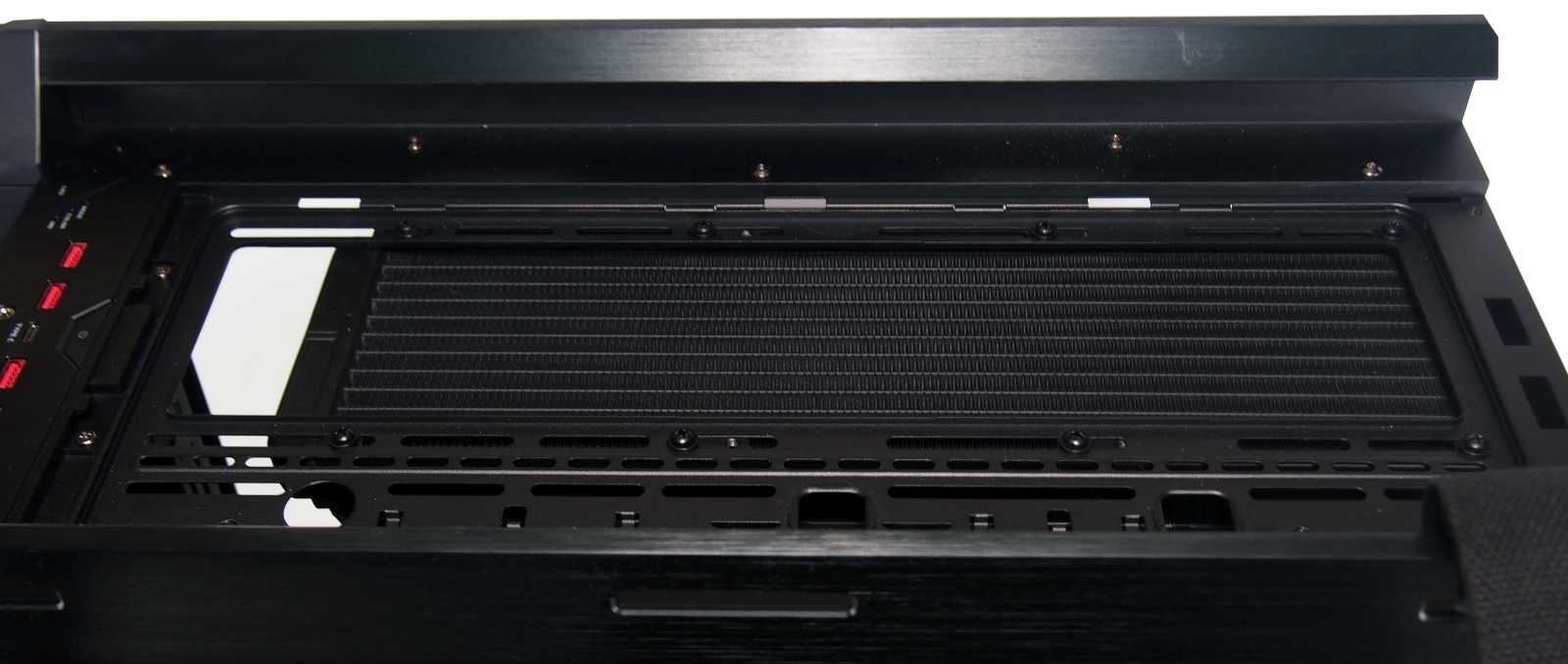 На верхней панели корпуса, кроме ручек, разместился длинный пылевой фильтр и «приборная панель». Помимо кнопок Power и Reset на ней находятся клавиши управления скоростью вращения вентиляторов и кнопка регулировки подсветки. С помощью последней клавиши можно синхронизировать подсветку с матплатой (она опознается как светодиодная лента), так и настроить её вручную. Во втором случае пользователь может выбрать профиль работы подсветки («статика», «дыхание», «стробоскоп» и «радуга»), так и её цвет. Для подключения периферии доступы 4 порта USB 3.1 Gen 1, а также один USB 3.1 Gen 2, выполненный в форм-факторе USB Type-C.