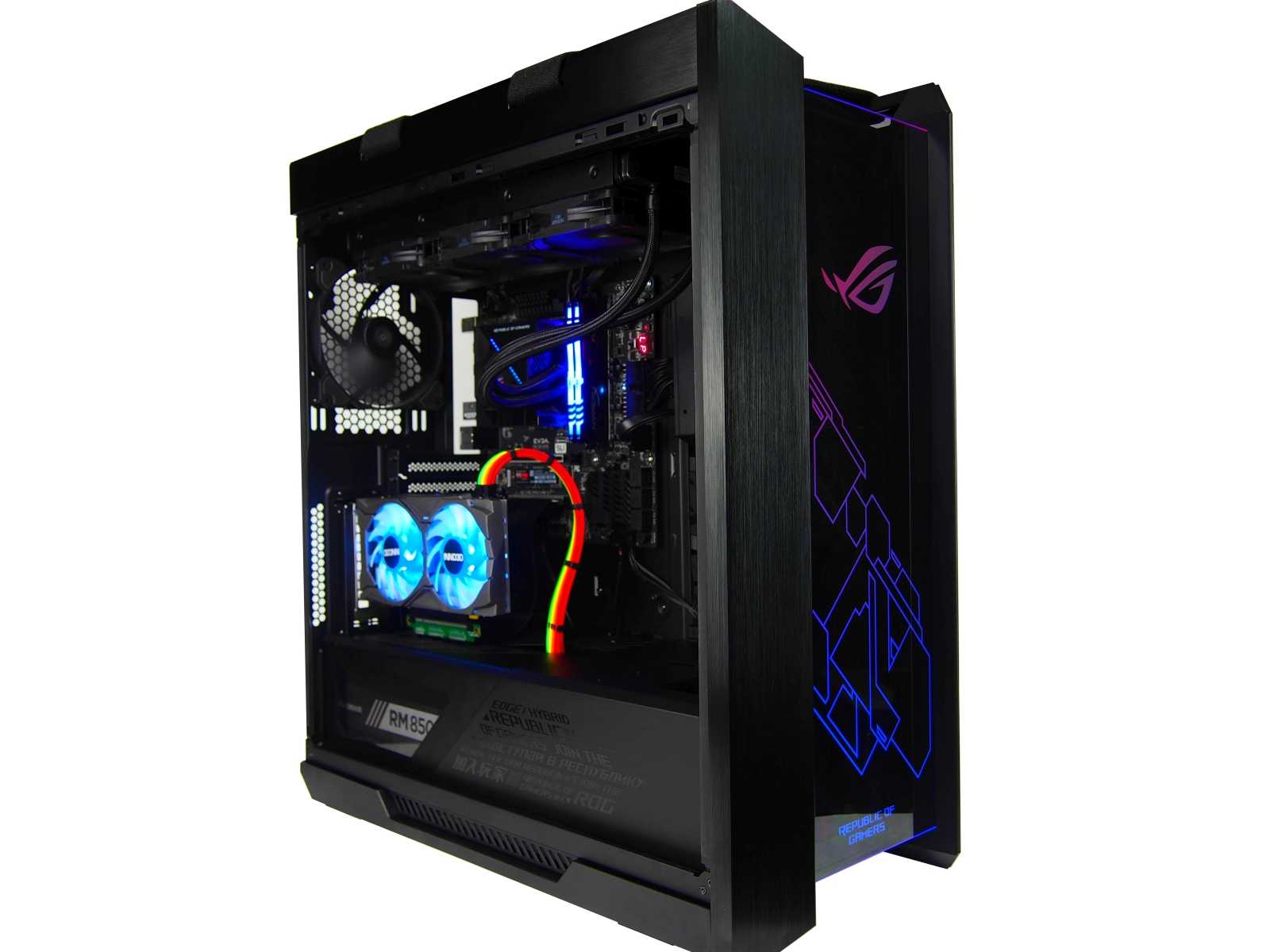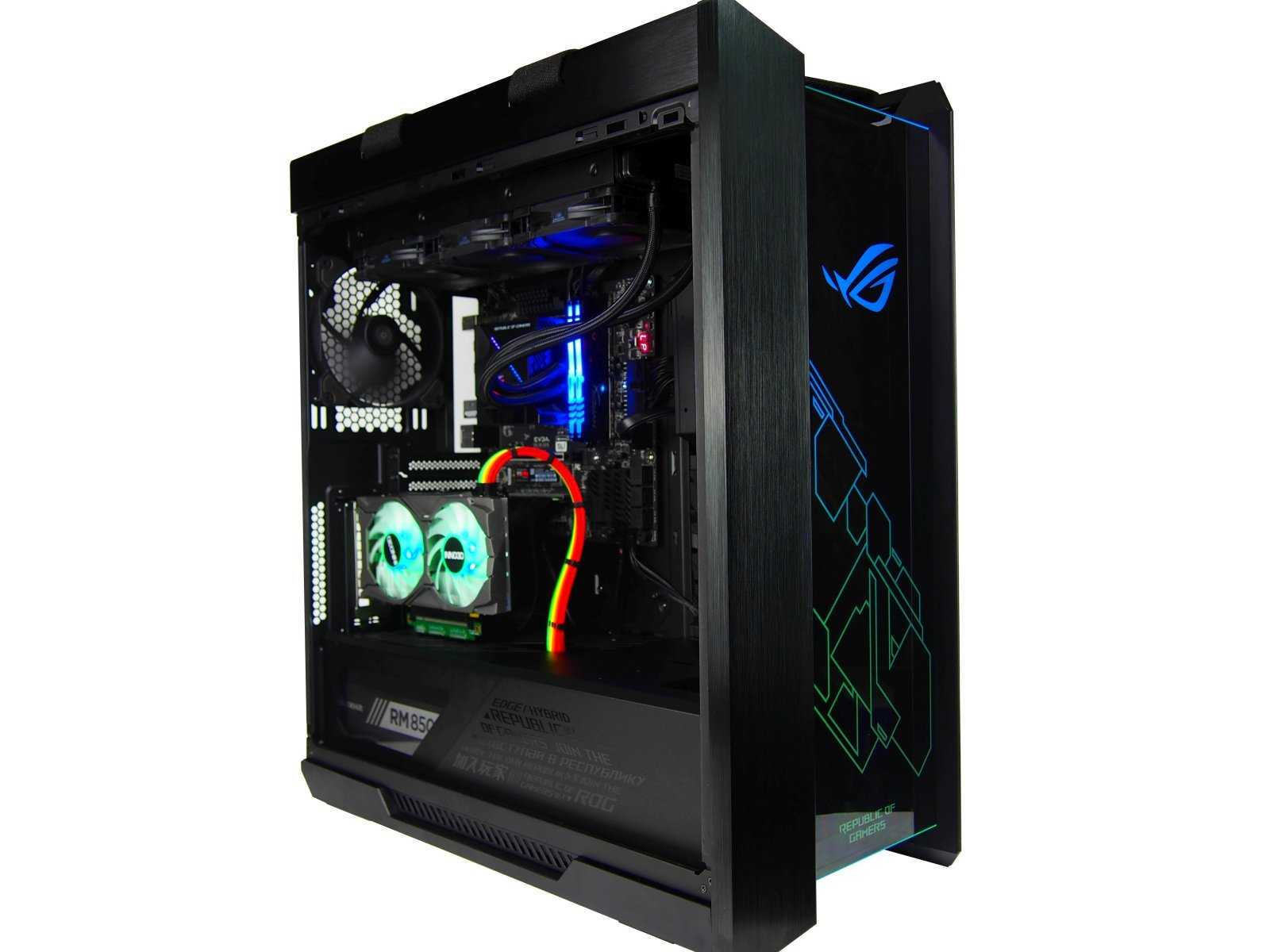 Такой получилась наша игровая сборка в корпусе ROG Strix Helios. Привлекательность обеспечил водоблок СЖО со встроенным дисплеем и видеокарта с RGB-подсветкой вентиляторов.
